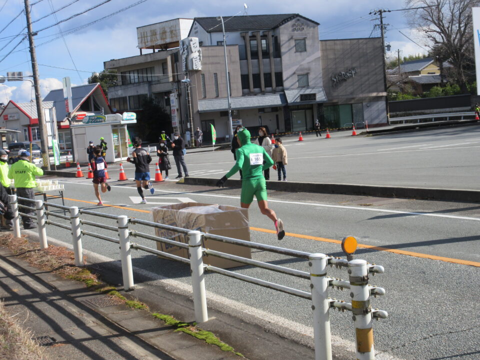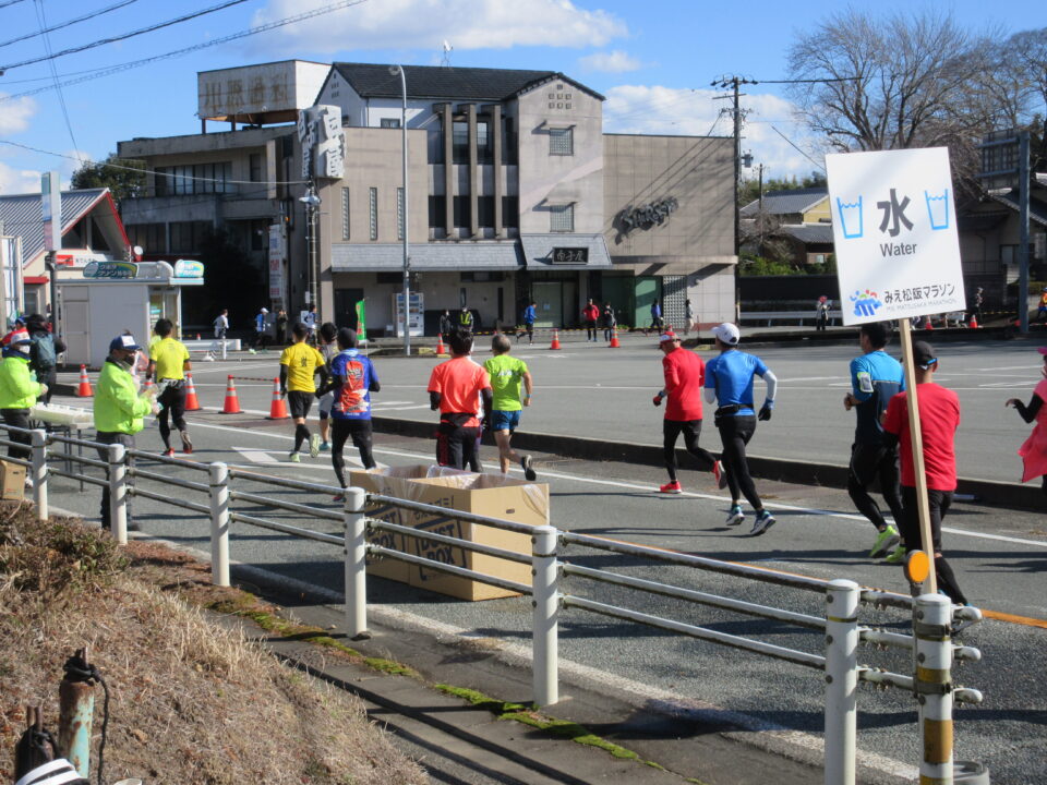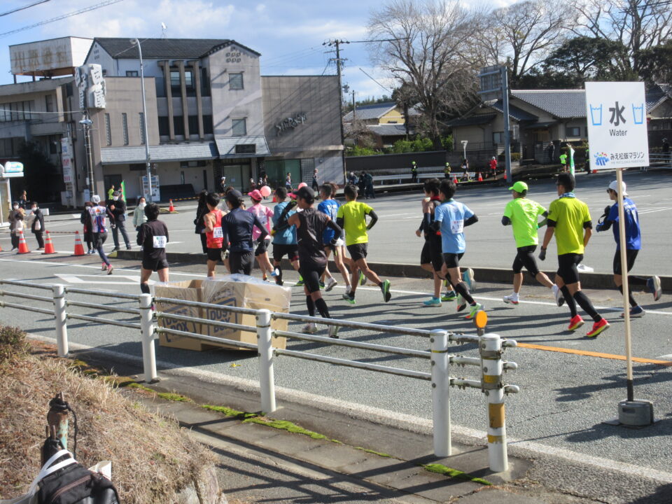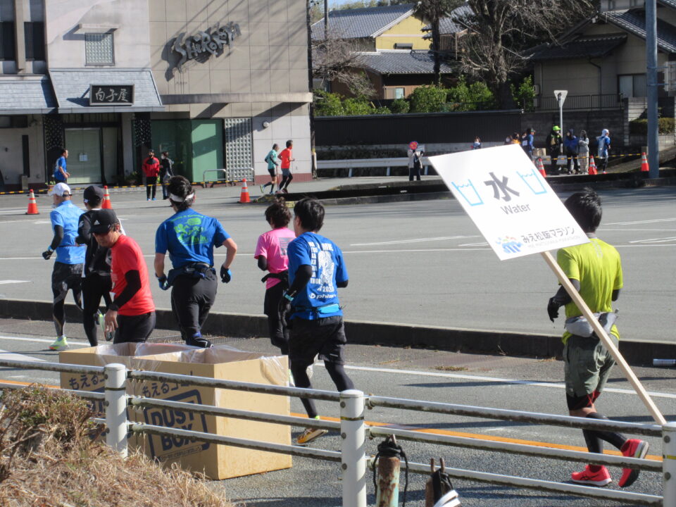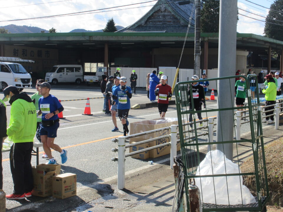 射和小学校の前の道路もランナーが駆け抜けました。丁度、35㎞地点の給水所に当たる場所になります。