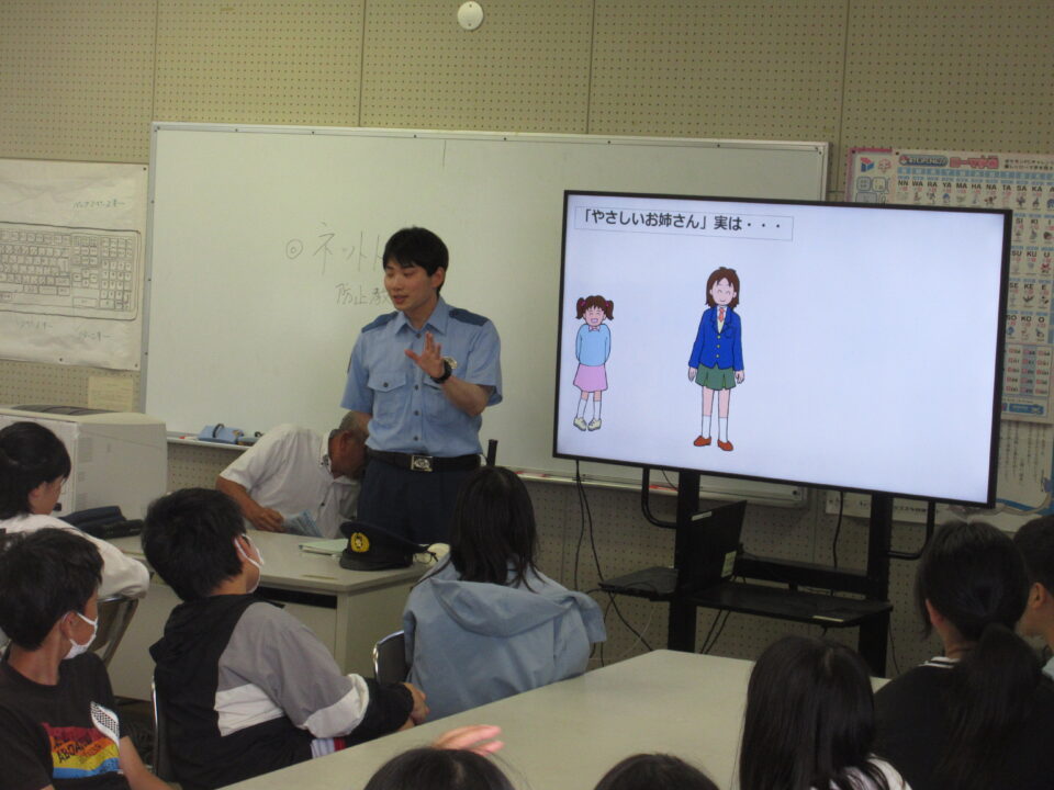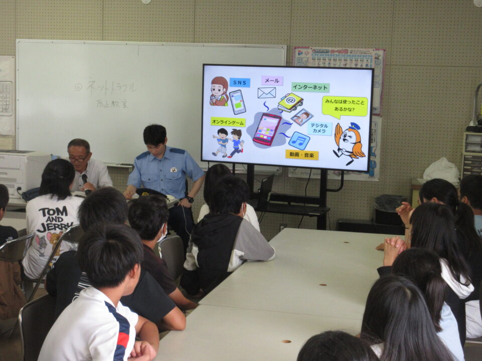 松阪警察署生活安全課のお二人の方に来ていただき、ネットトラブルについての話をしていただきました。最初はおまわりさんの持っているものについて紹介していただきました。子どもたちも興味深々でした。