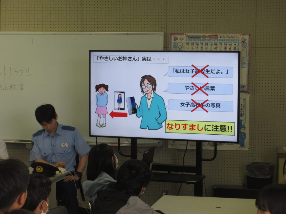 スマートフォン等の普及で、小学生にとってもインターネットやSNSは身近なものになっています。メールは文字がならんでいるだけだからかんちがいしやすいことや、悪口や個人情報はいったんSNS等で公開してしまうと、世界中の人々に見られて警察でも消すことはできないことなど、実際にあった事例を紹介しながら話をしていただきました。今は小学生でも、知らないうちにネットトラブルに巻き込まれる事案が増えているようです。そうならないように、困ったことや心配なことがあったらできるだけ早く家族や大人に相談するように教えていただきました。ご家庭でも、一度スマートフォン等の使い方やルールについてお子さんとお話をしてみてください。