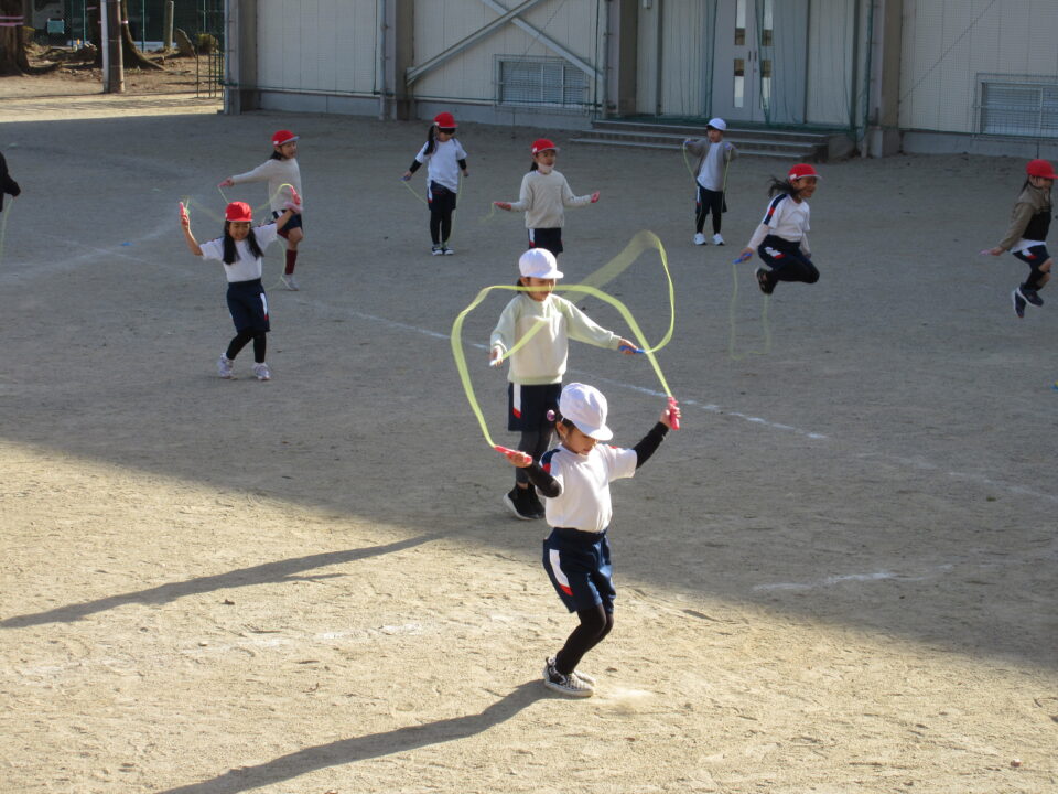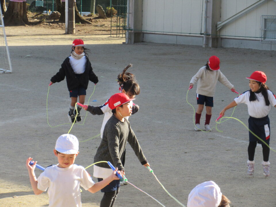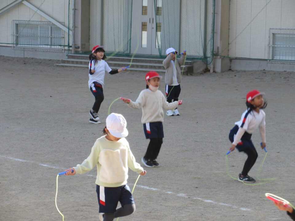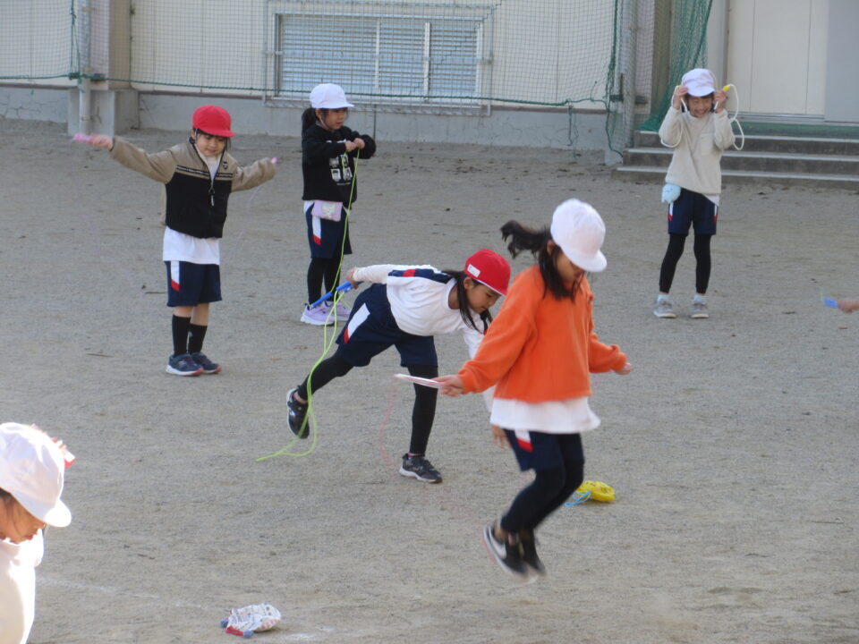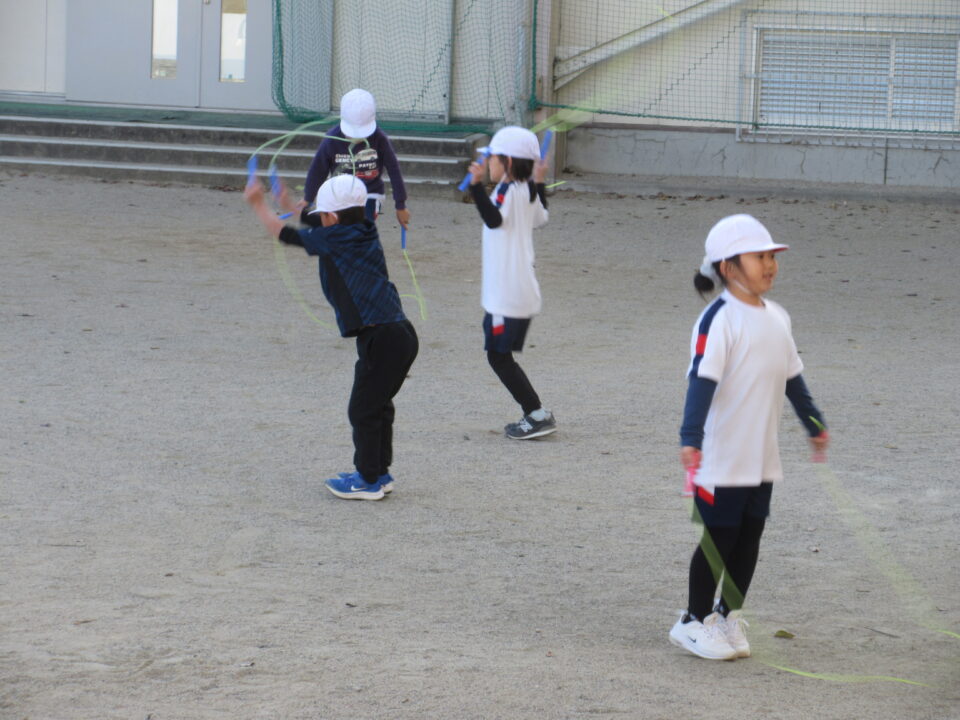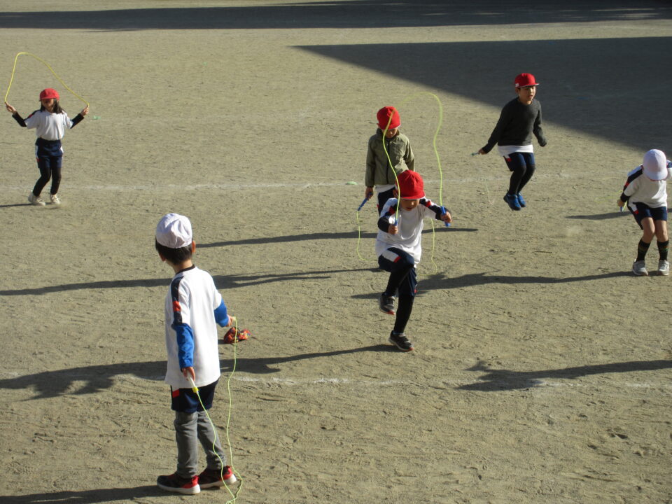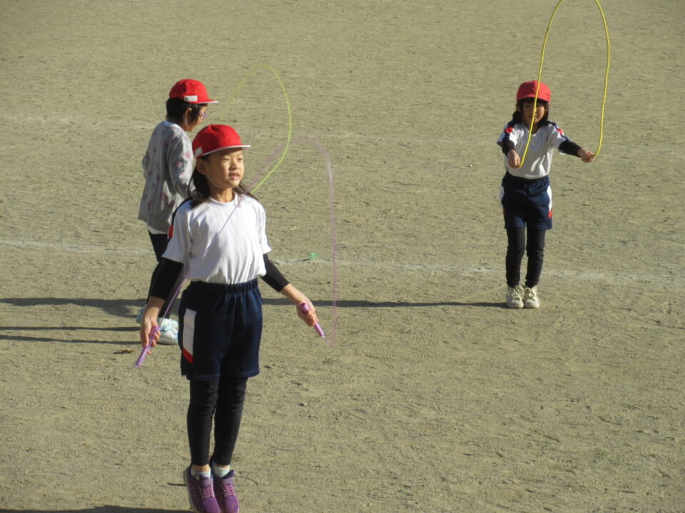 少し寒くなってきました。体育の時間、運動場では1年生が縄跳びを頑張っていました。