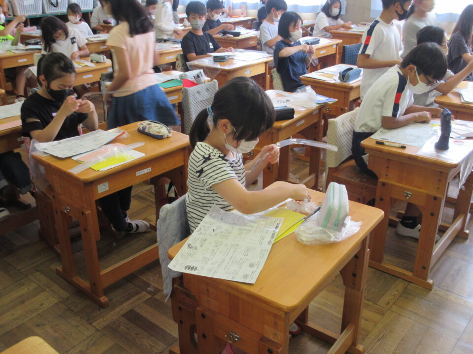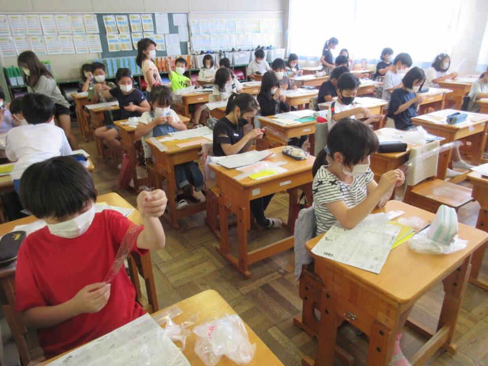 4年生。図工の作品「コロコロガーレ」を作っています。みんな夢中になっています。