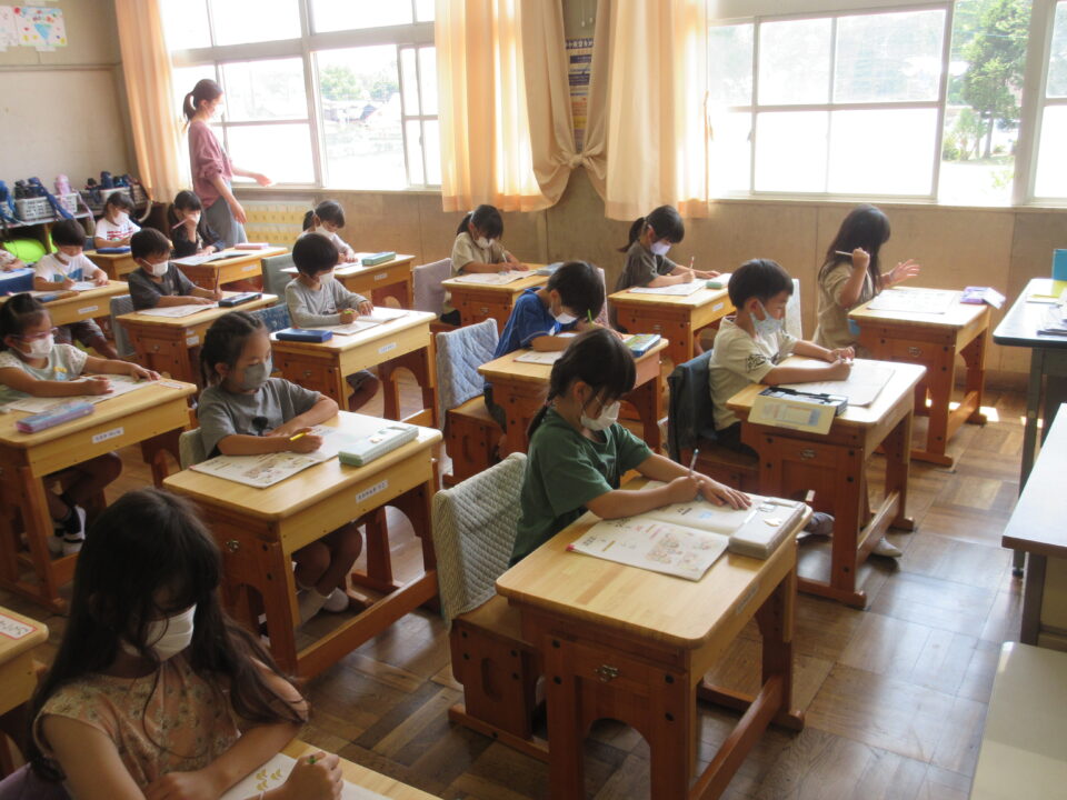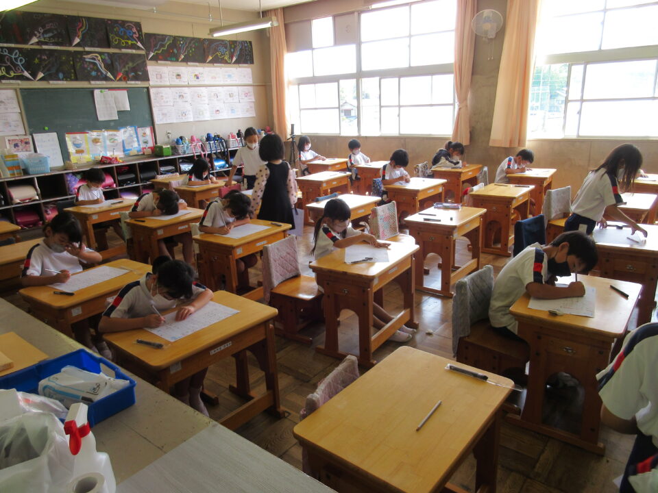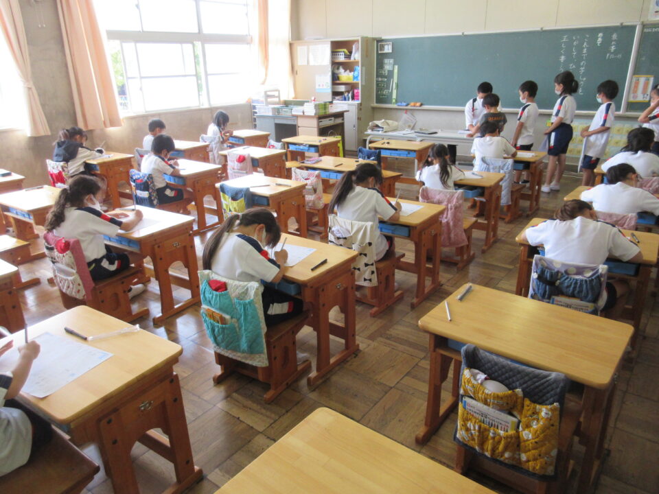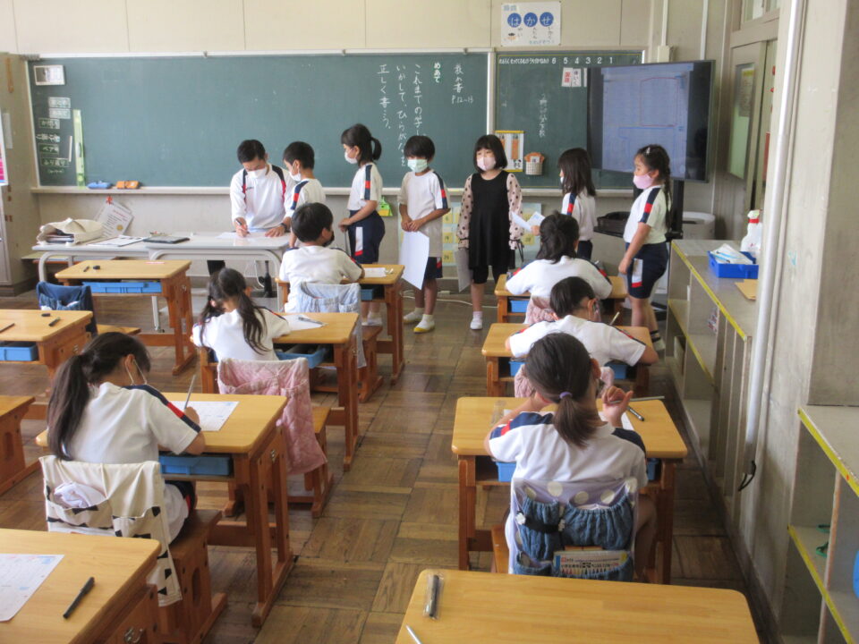 2年生。書写の時間。一文字一文字、落ち着いて丁寧に書いています。先生に確認をもらうための列ができていますが、みんな静かに並んでいます。