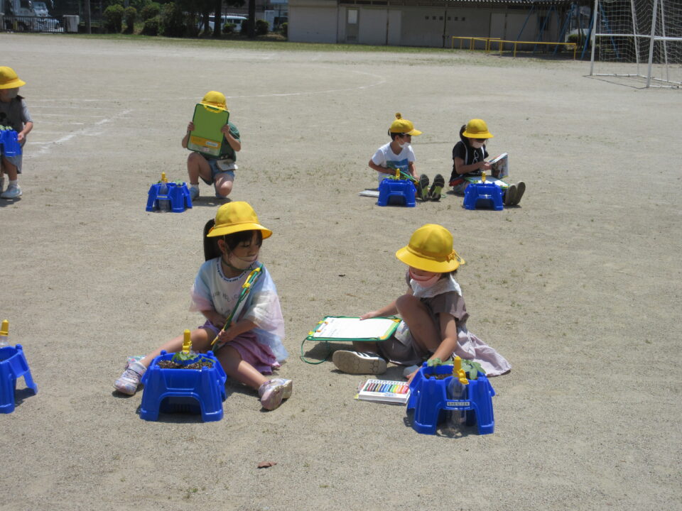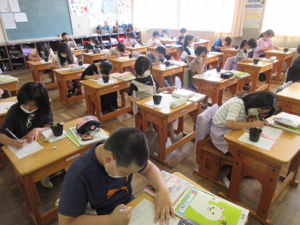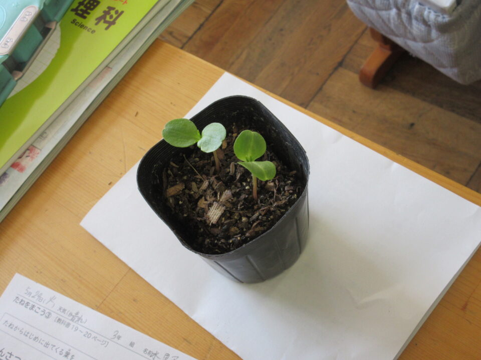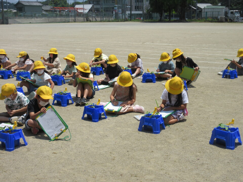 3年生。ホウセンカが発芽してきました。自分が大切に育てているホウセンカを観察し、絵を書いています。