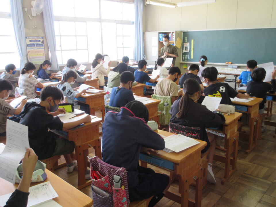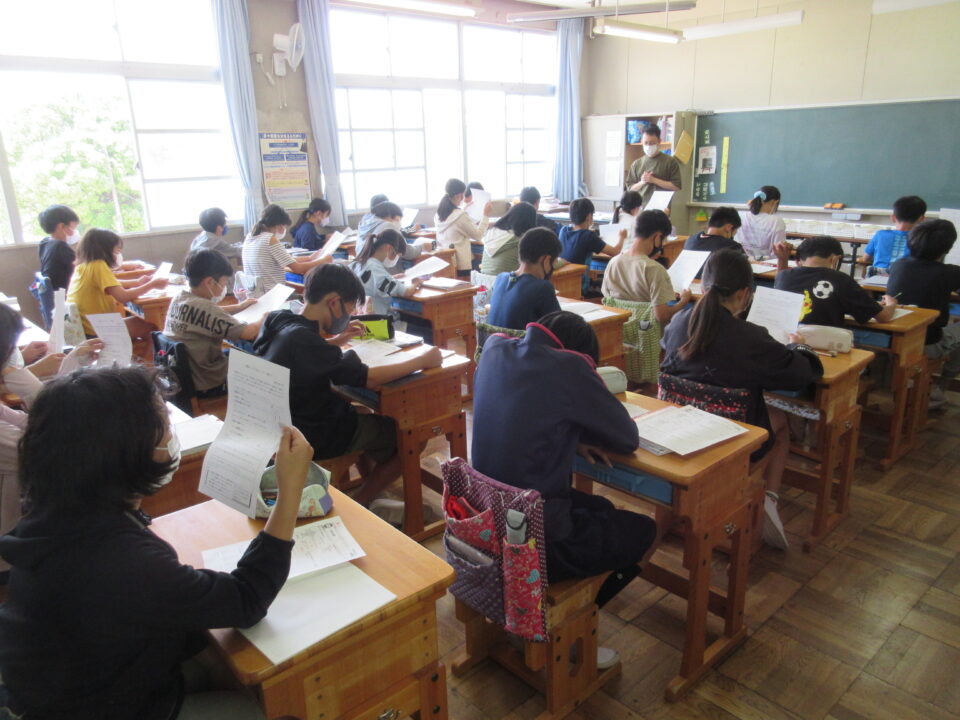 6年生は、テスト返しが終わった後に家庭学習で「テスト直し」に取り組みます。テスト直しの仕方についての説明を聞いています。