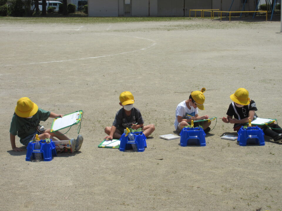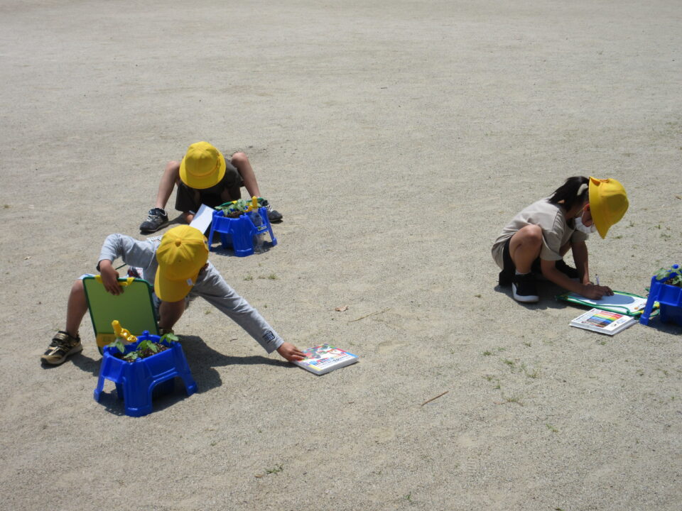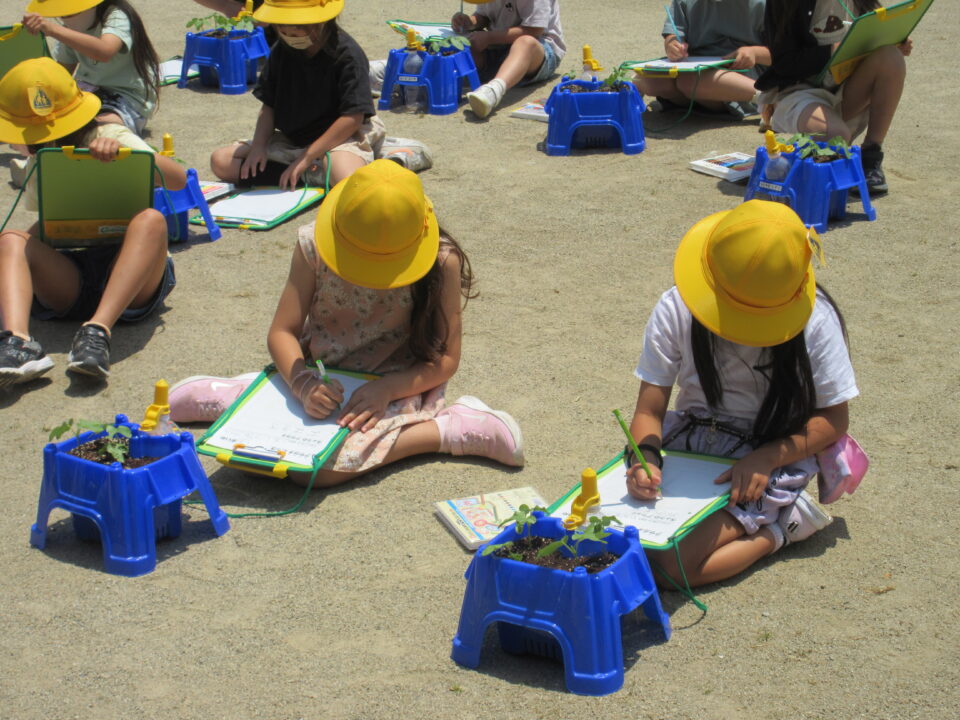 1年生。朝顔の観察です。毎日水やりを頑張っています。その甲斐あって朝顔はしっかりと成長しています。
