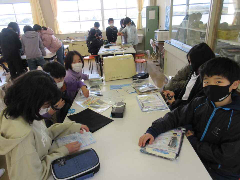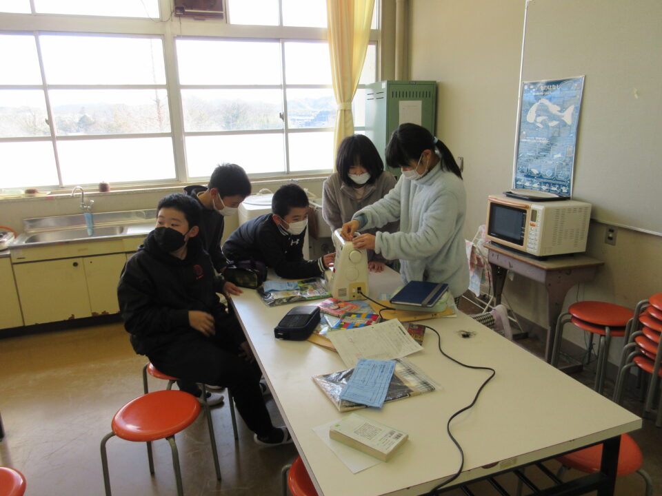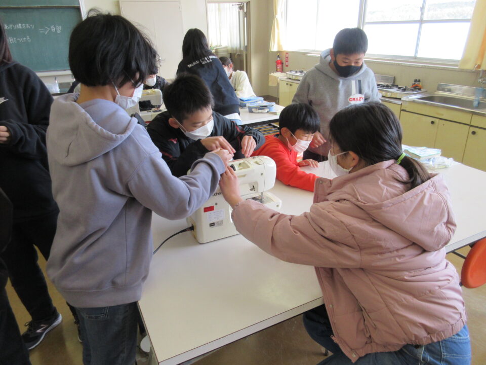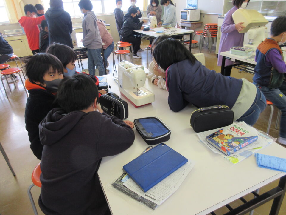 5年生の家庭の時間です。ミシンを使って自分のエプロンを作ります。ミシンの使い方を班で確認します。