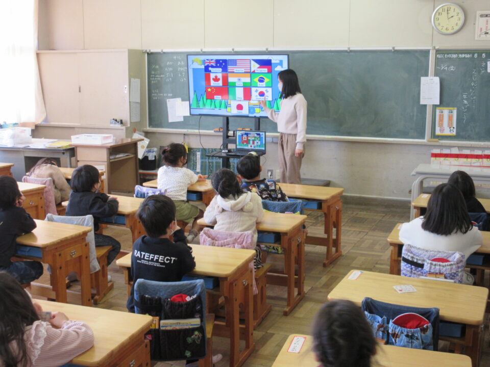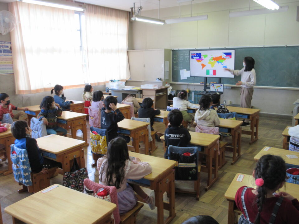 1年生はALTの先生との英会話を楽しみました。とても元気に頑張っています。