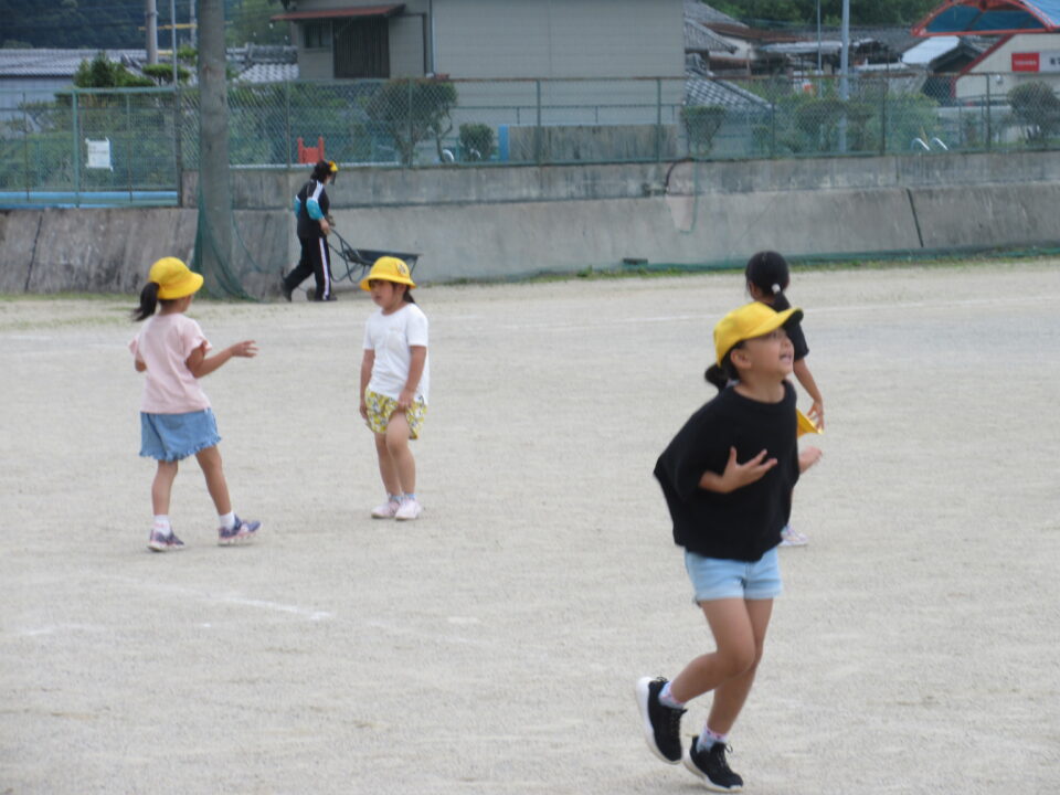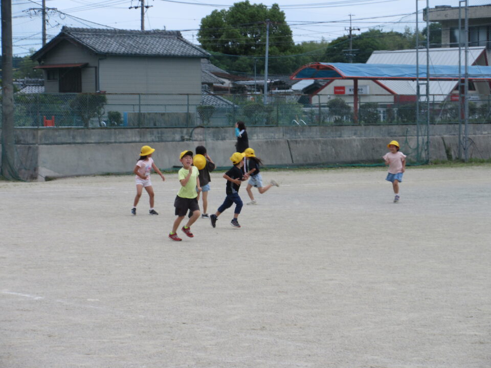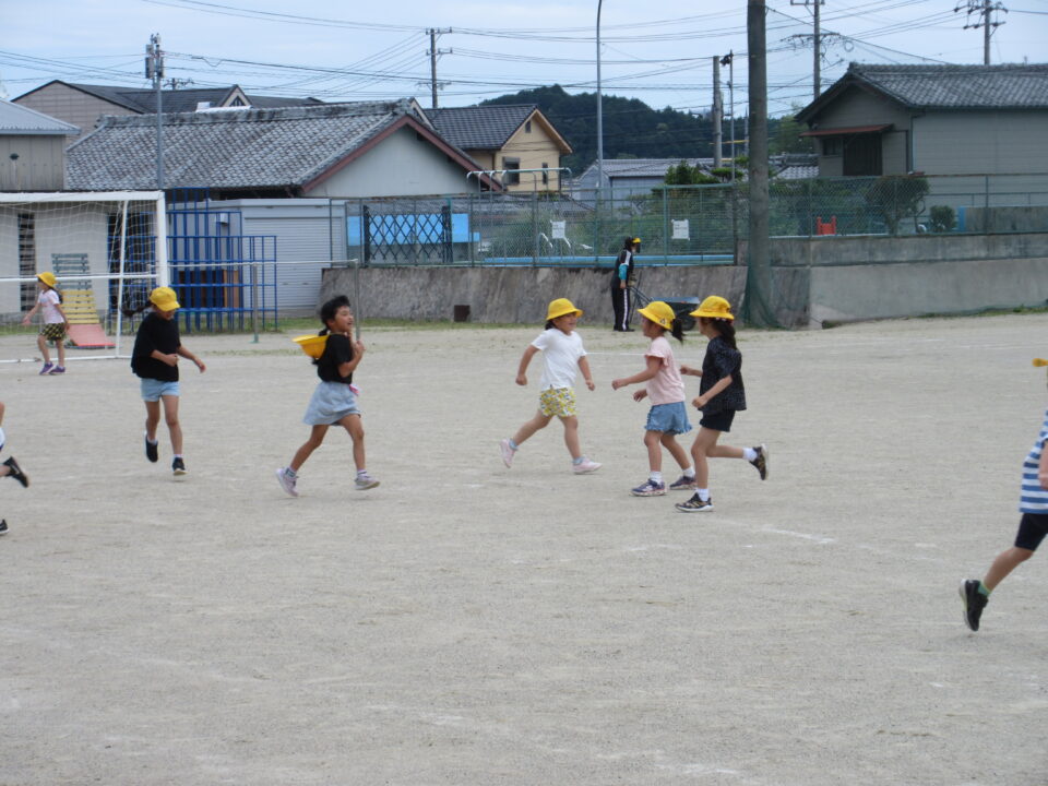 1年生の鬼ごっこ。運動場での遊びです。今日は5月生まれの誕生日の子のお祝い会です。この場面では、マスクを外して、みんな懸命に走っていました。