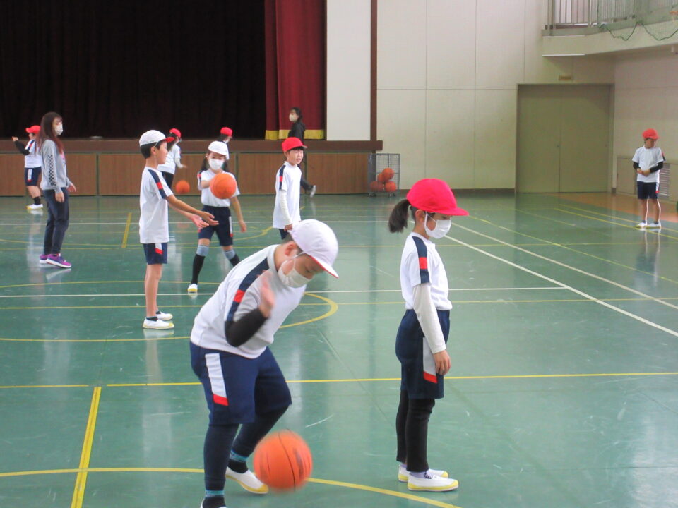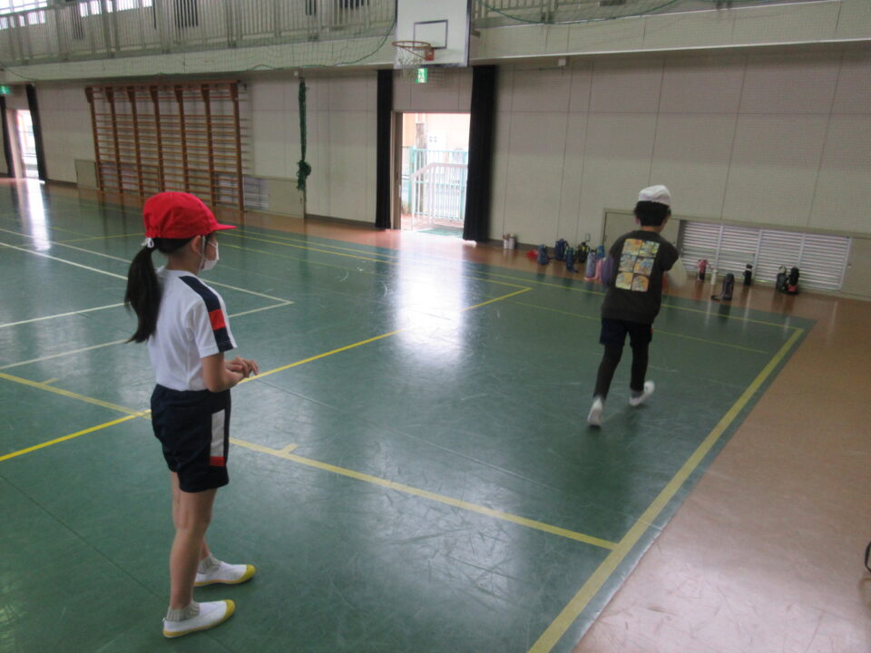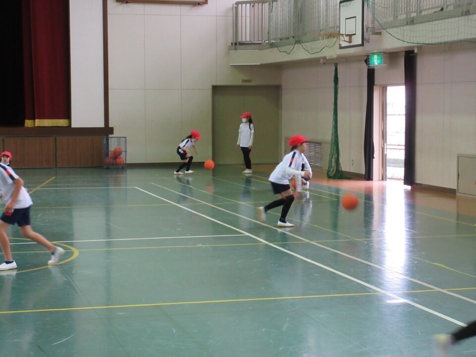 3年生は体育館で体育の時間。ポートボールの練習です。