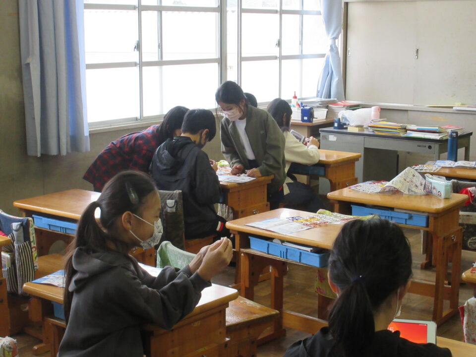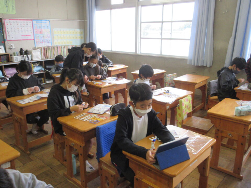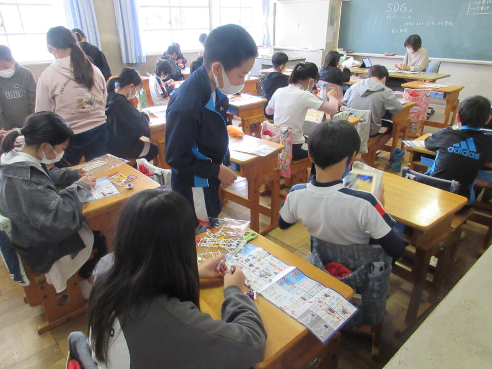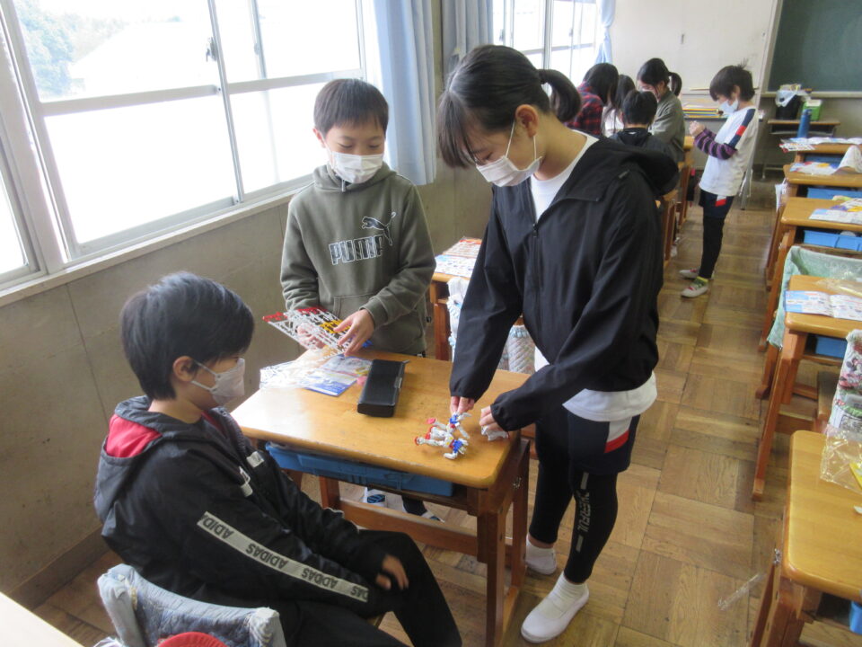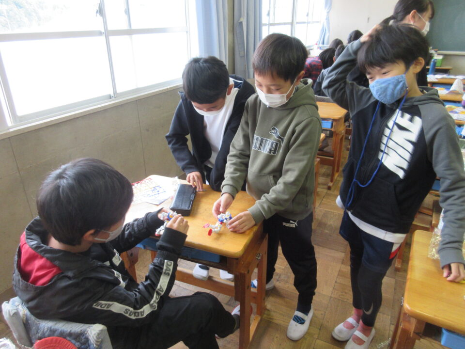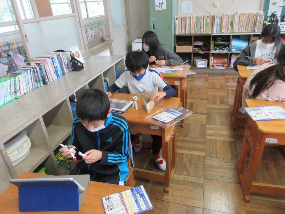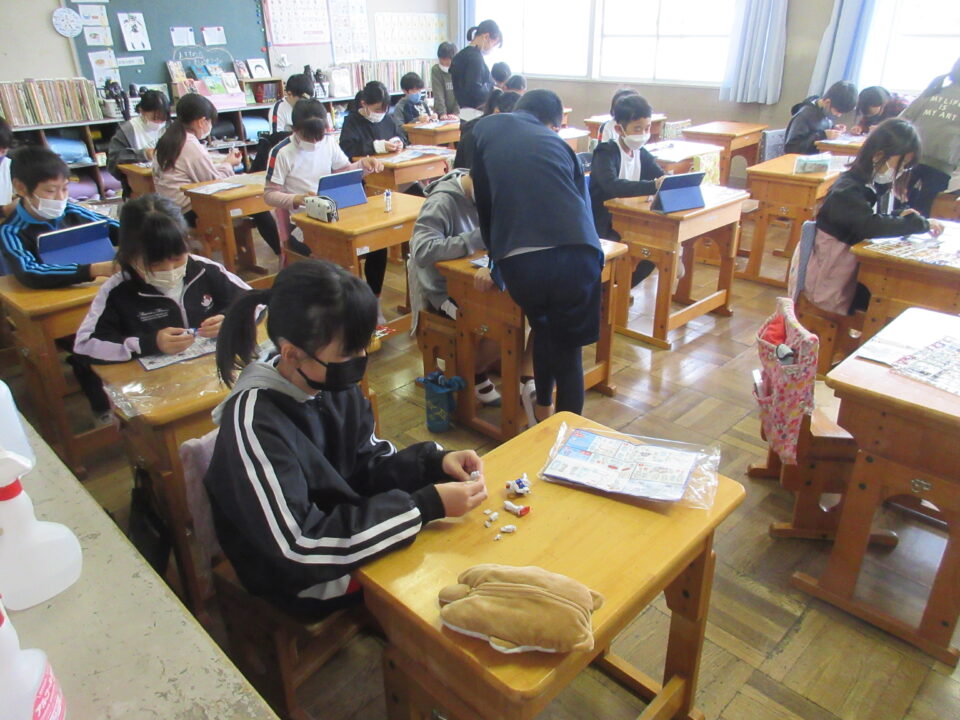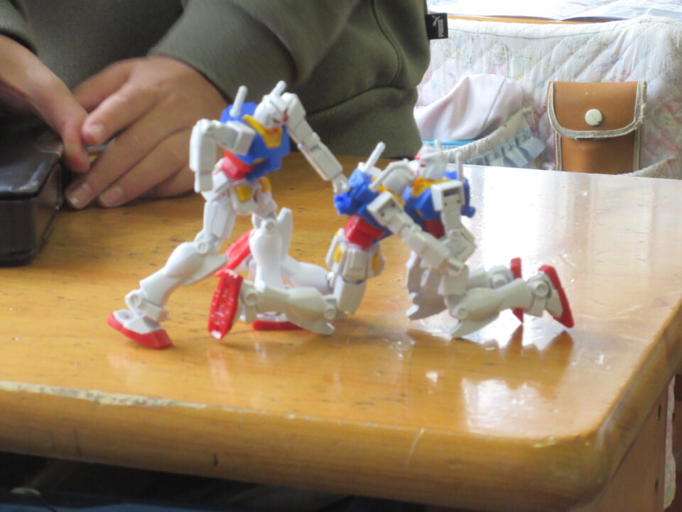 5年生。ガンダムのプラモデル作りです。できあがったガンダムにポーズをつけ、写真を撮ってみんなで共有します。