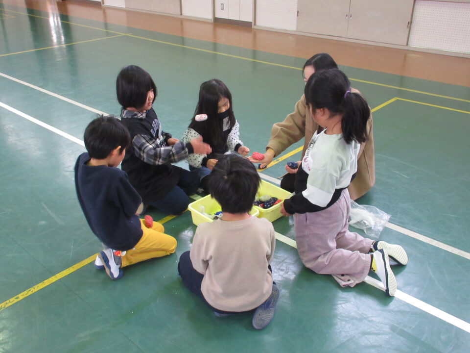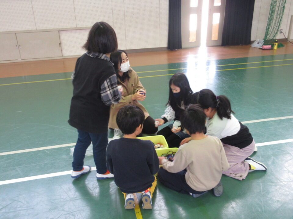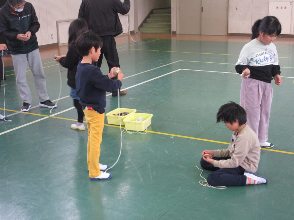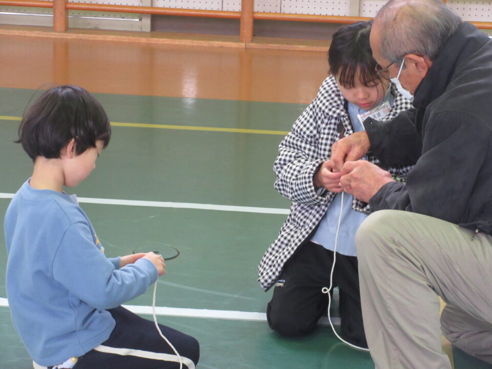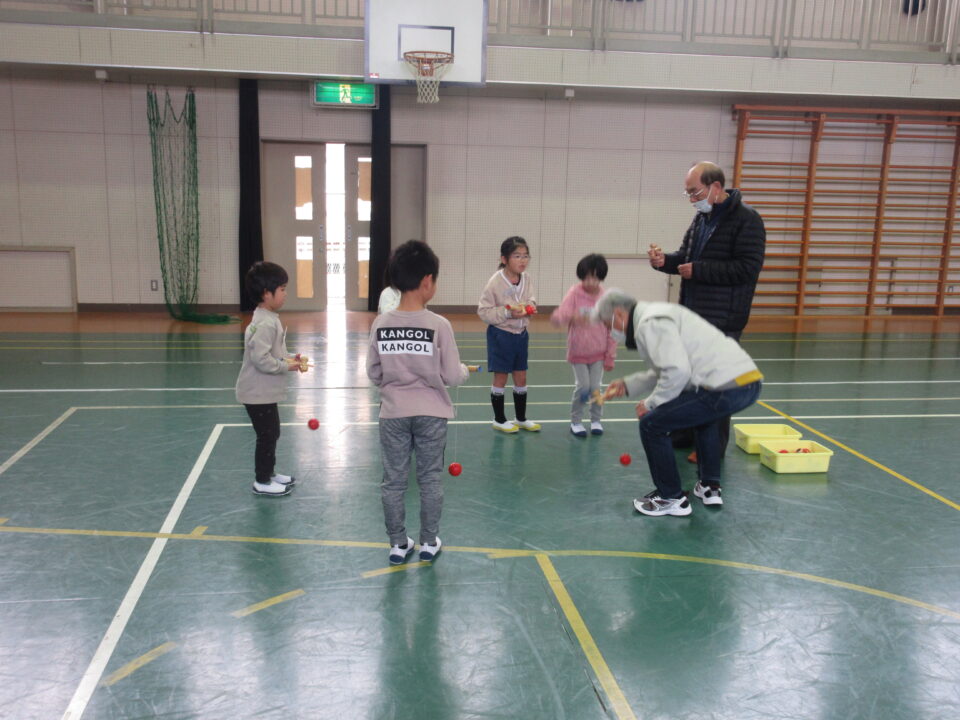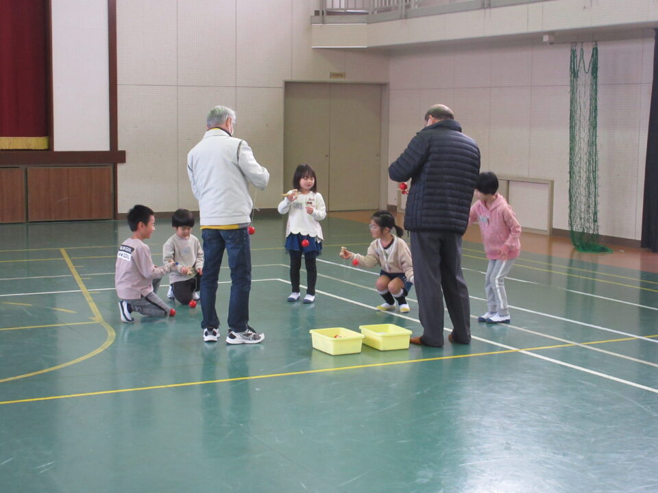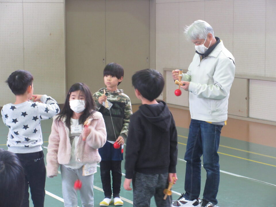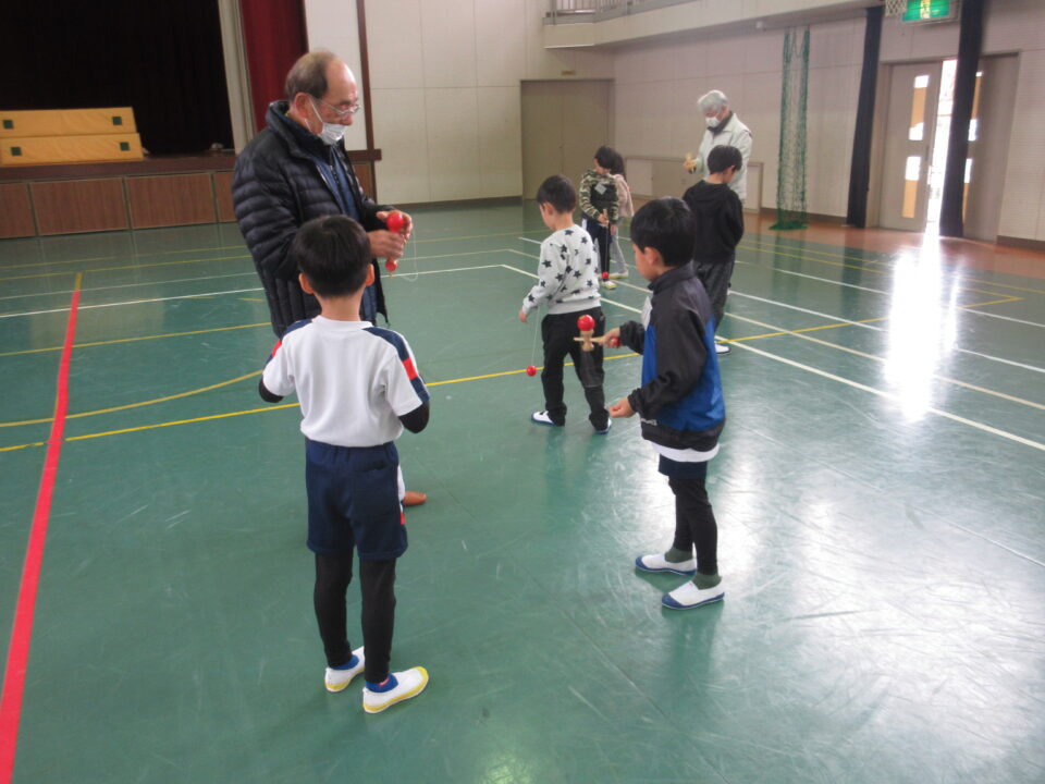 今日は1年生が昔の遊び(けんだま、こままわし、めんこ、おてだま、あやとり)を同窓会の皆さんと一緒に楽しみました。すでに上手にけん玉をしたりこまをまわしたりする子がいる一方で、それらに悪戦苦闘している子など様々でした。同窓会の皆さんも中には悪戦苦闘されている方もみえ、いっしょに遊びを楽しむことができました。微笑ましいひとときでした。