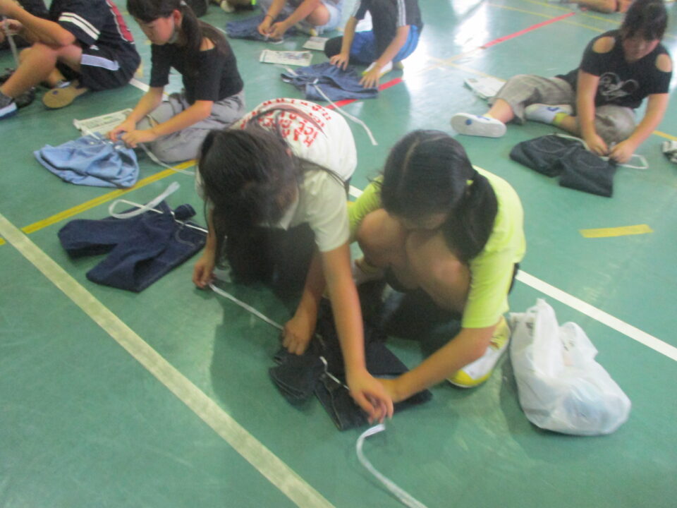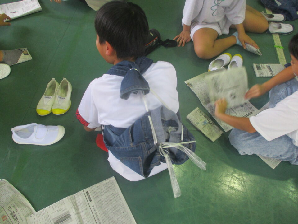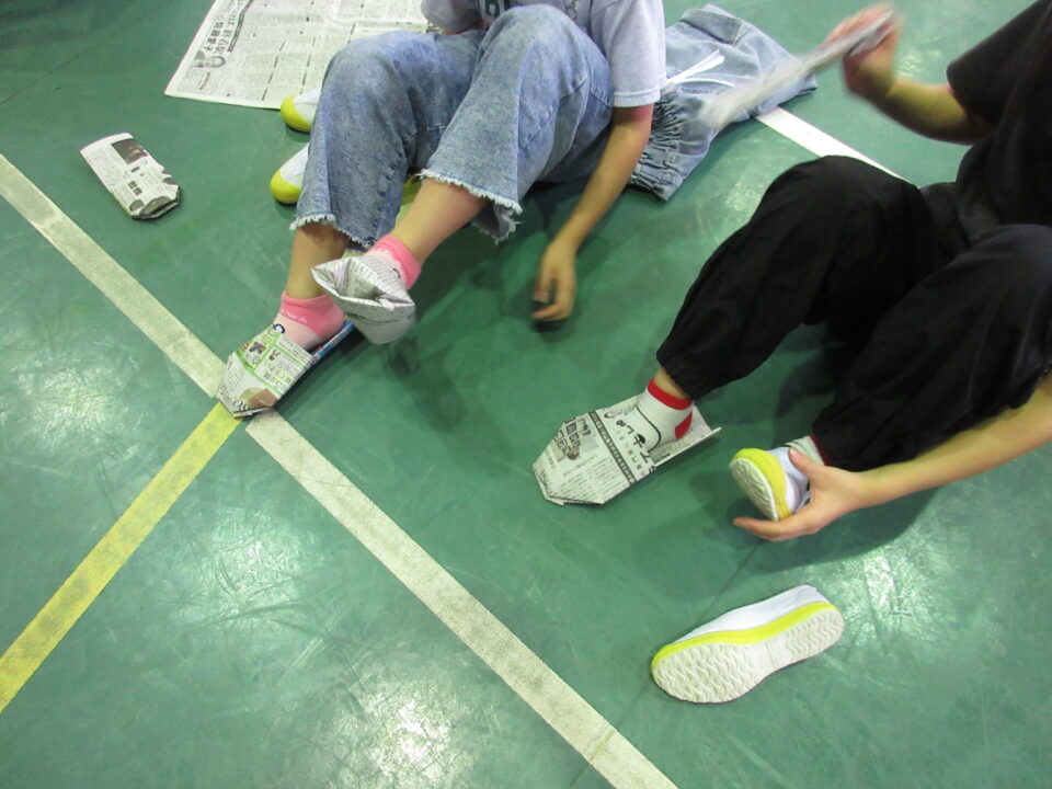 6時間目は、ズボンで即席リュックを作ったり、新聞紙簡易スリッパを作ったりしました。