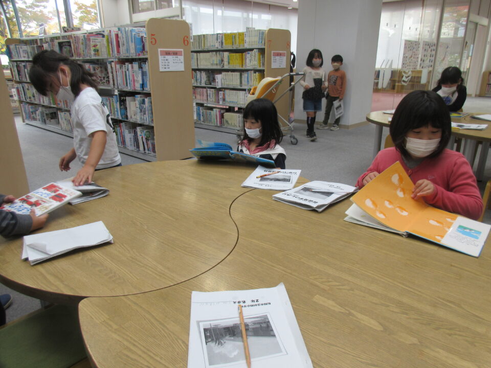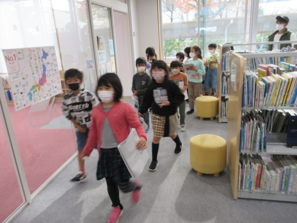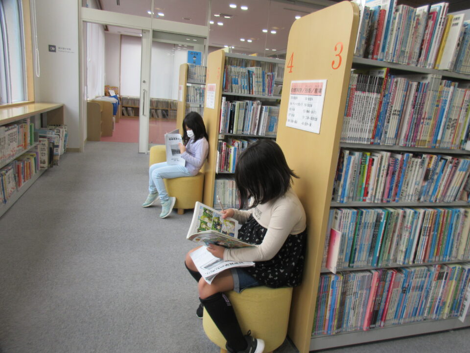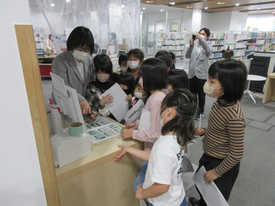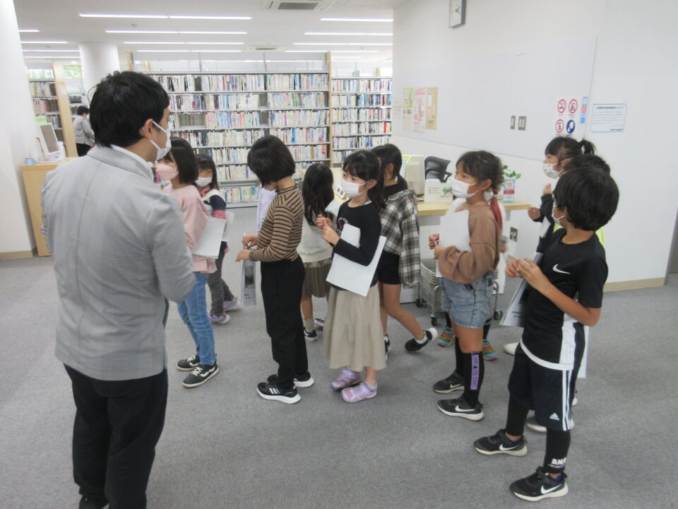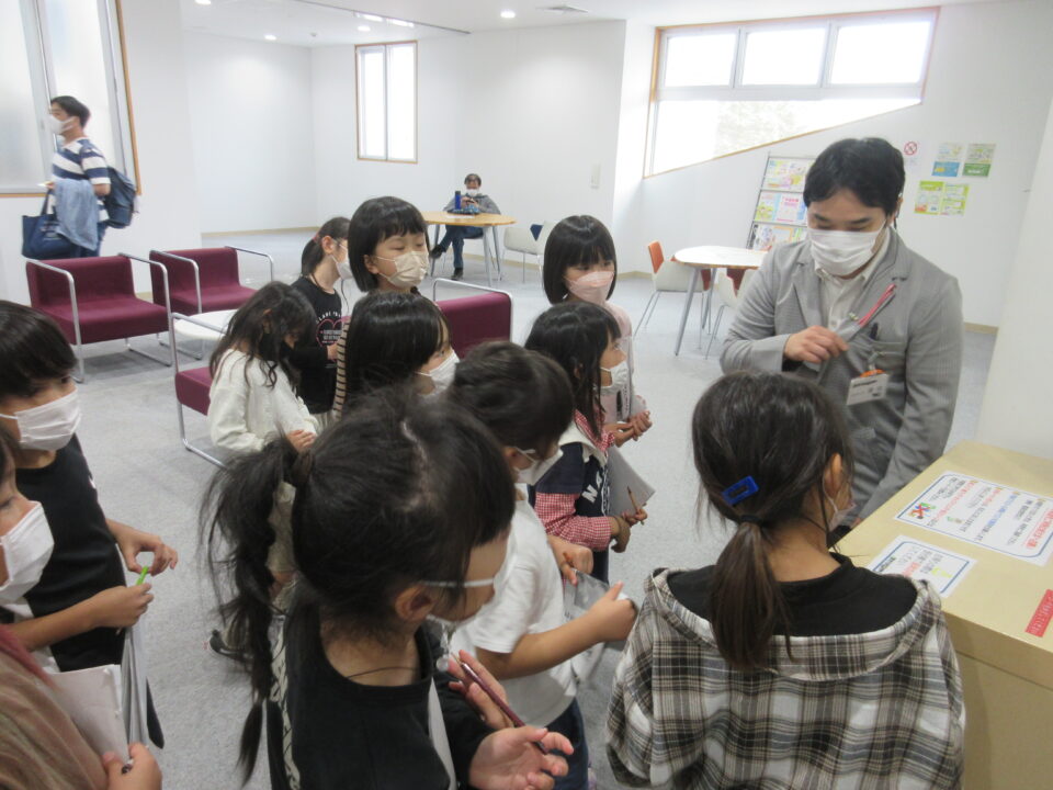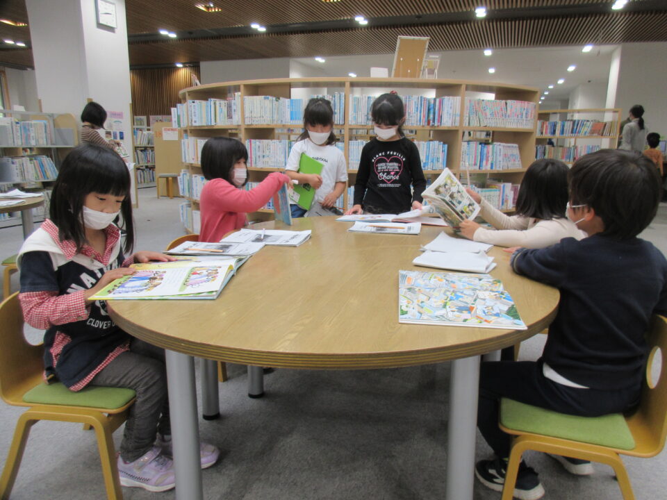 松阪に戻ってきて、松阪図書館の見学です。本が大好きな子どもたち、スタッフの方の話を真剣に聞き、自分の興味のある本を探したり、早速手に取って読んでみたりしました。