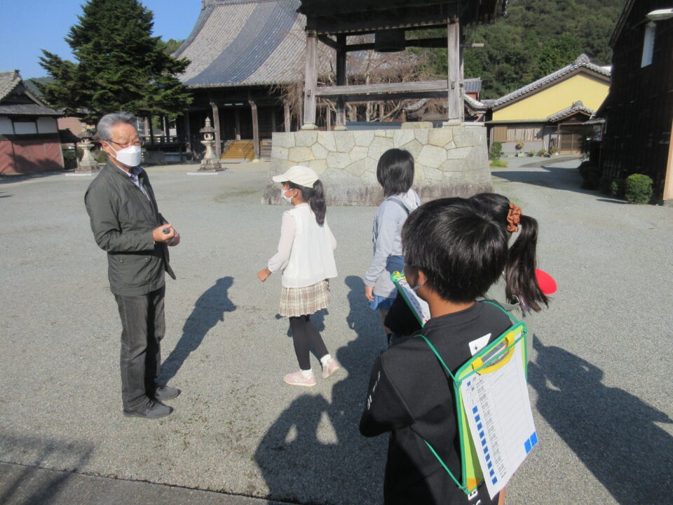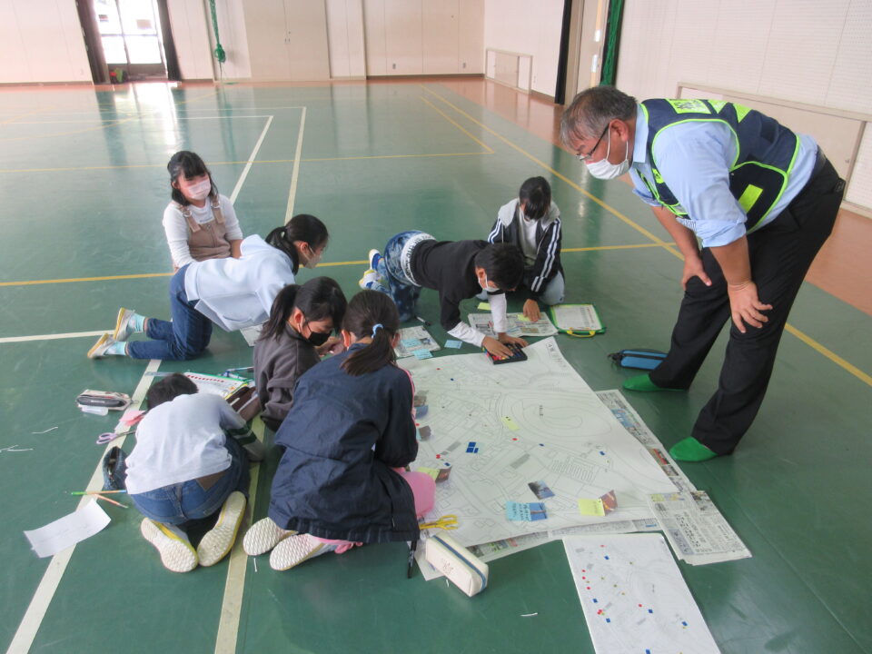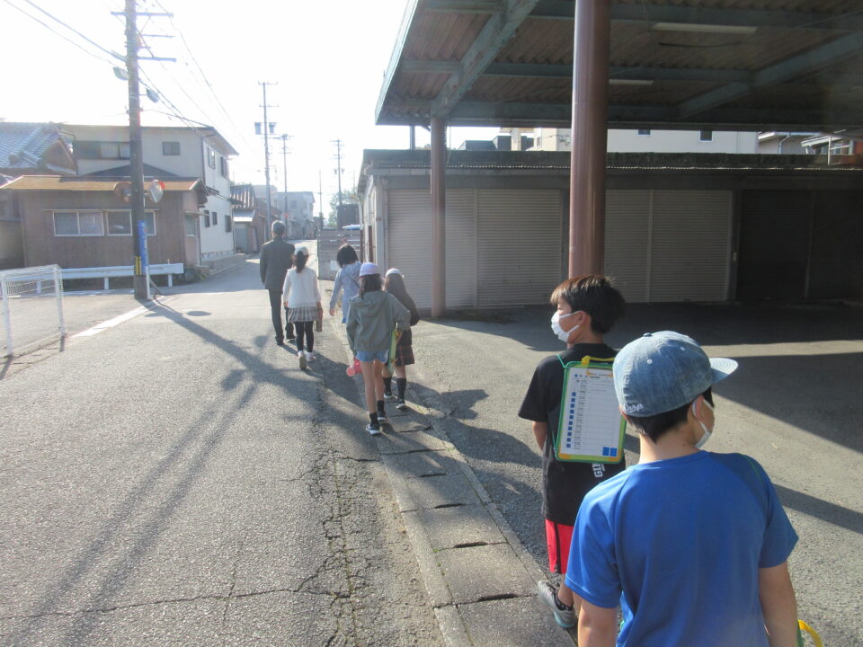 4年生が5つの班に分かれて、射和町のタウンウォッチングを行いました。市の地域安全対策課の方や自治会長さんをはじめ地域の方々に同行していただき、自分たちの住むまちを歩きました。自分の命、友だちの命を守るため、防災、防犯、交通安全の面で、危険な場所を確かめたり、役立つ場所や物がどこにあるのかを調べました。