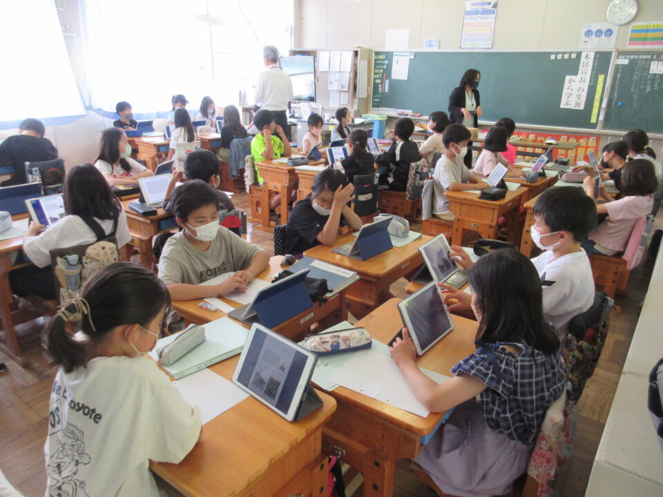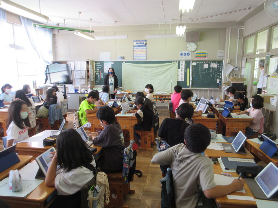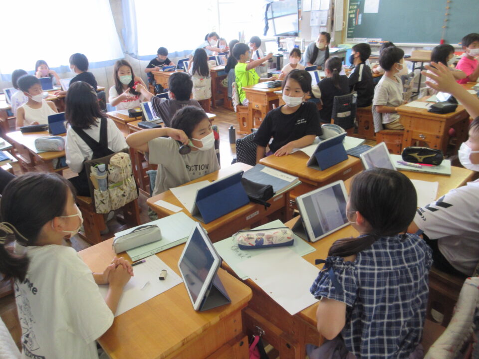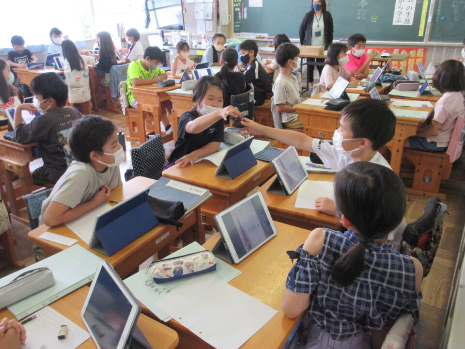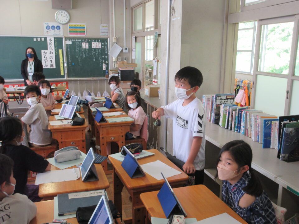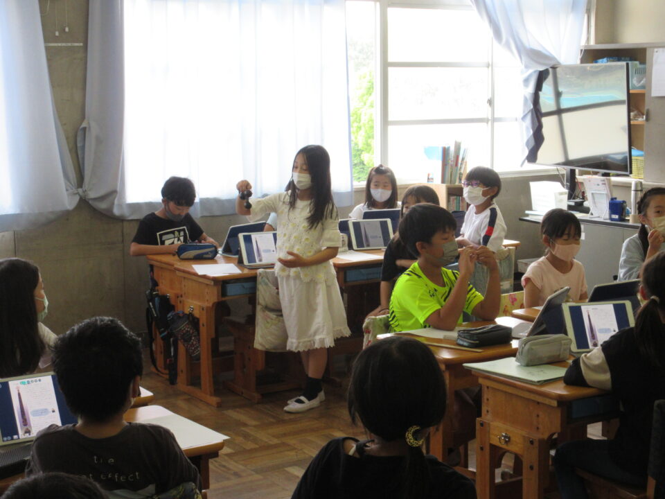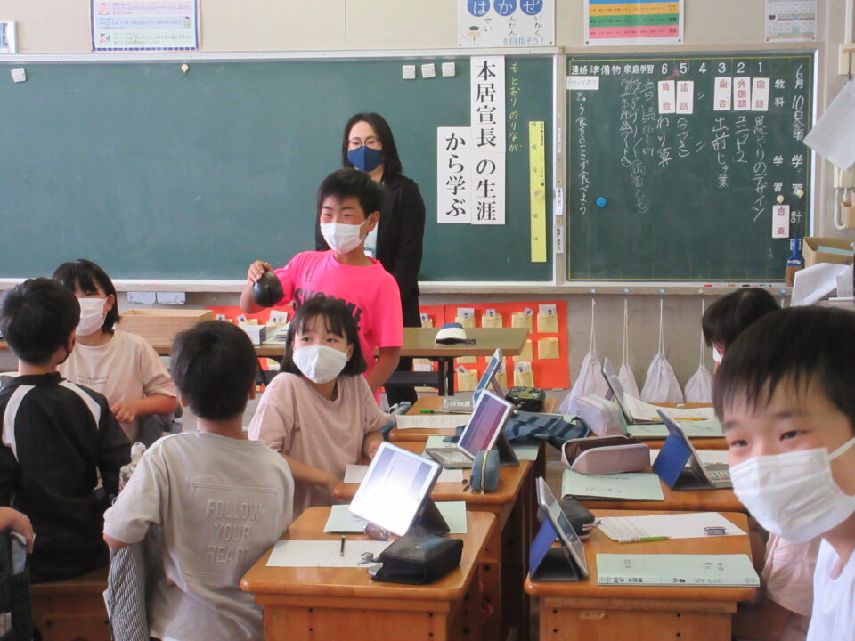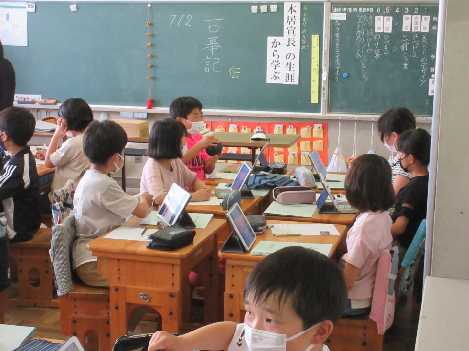 4年生の総合学習の時間です。郷土の偉人、本居宣長の学習です。今日は、本居宣長記念館の指導員さんにご来校いただき、本居宣長の生涯についての出前授業をしていただきました。子どもたちは、指導員さんのお話を真剣に聞き入っていました。また、宣長さんが親しんだ鈴や松阪木綿を見せてもらい、子どもたちは楽しみながら深く学ぶことができました。