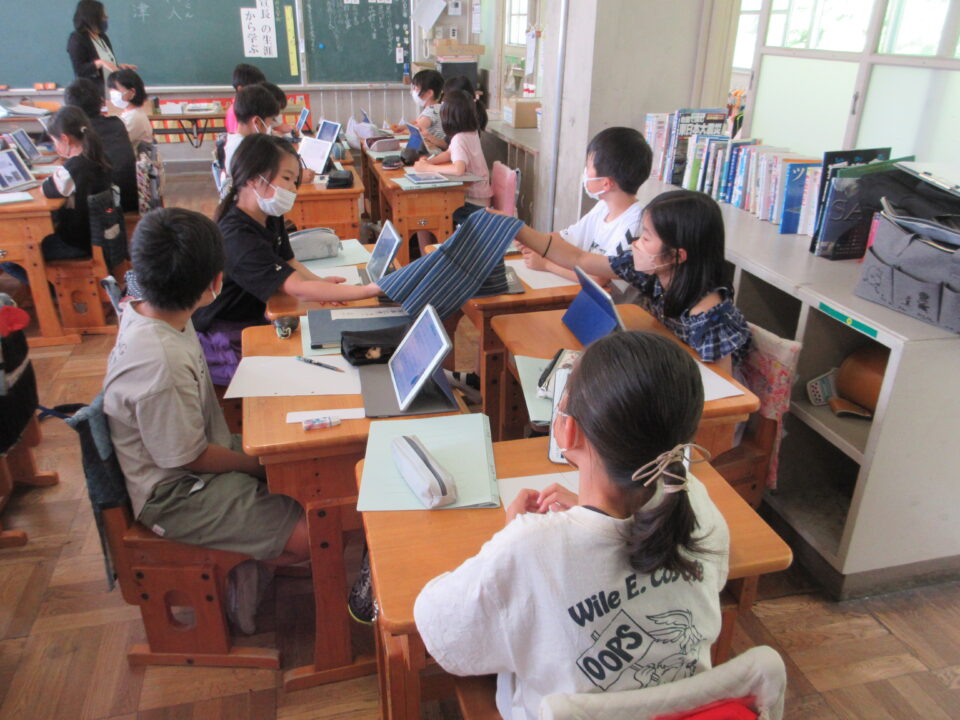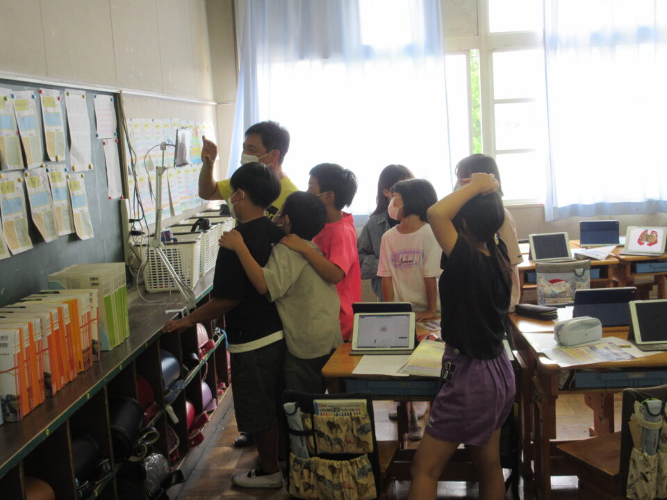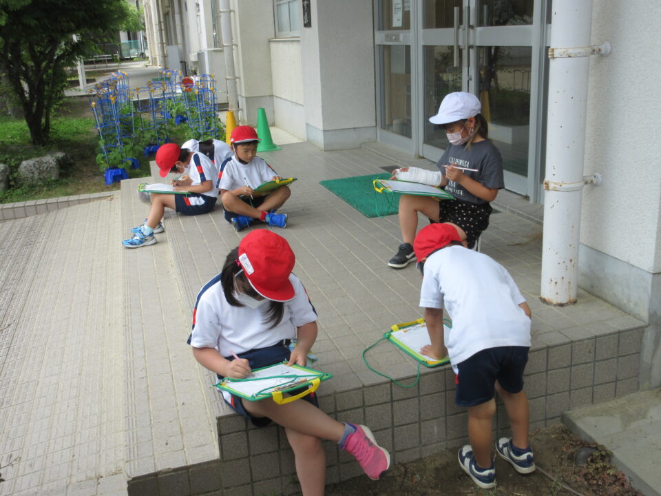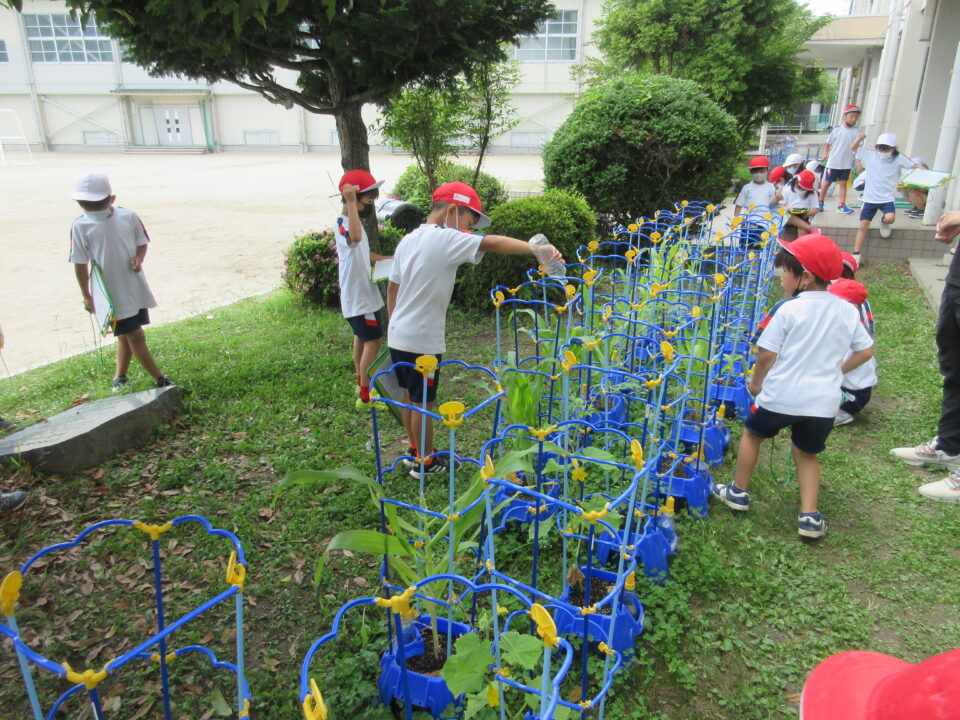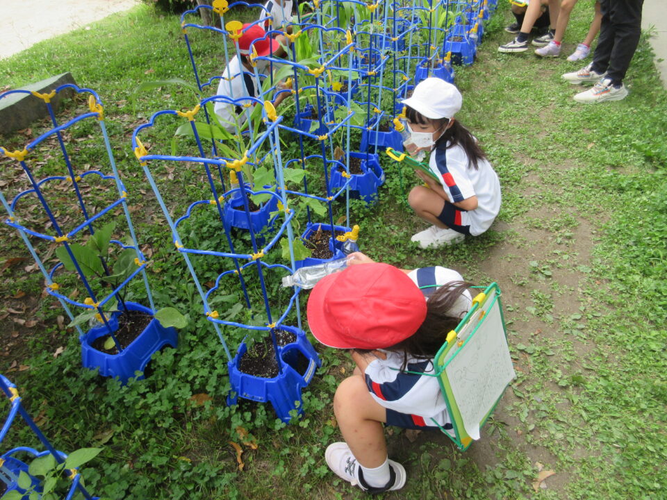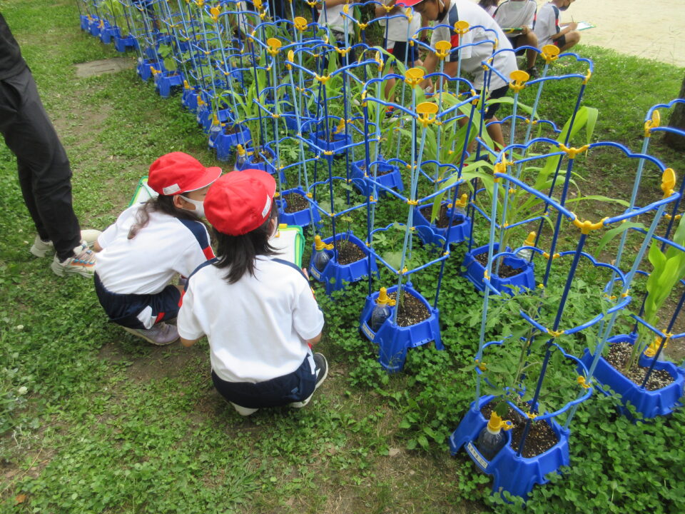 2年生。自分たちで育てている、トウモロコシ、オクラ、きゅうり等の観察です。しっかり育てているので、とても順調に成長しています。
