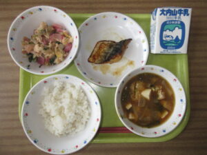 今日は2月の「ちゃちゃもランチ」の日です。今日の献立は、ご飯(麦入り)、牛乳、さばの塩焼き、松阪赤菜の和え物、あおさのみそ汁です。今日登場した松阪市の食材は、「松阪赤菜」と「あおさ」です。「松阪赤菜」は、美味し国「三重の伝統野菜」6品目の1つに登録されている野菜です。「あおさ」は、五主町や漁師町などの海で育てられています。海のミネラルやビタミンがたっぷりの旬の「あおさ」と「松阪赤菜」をおいしくいただきました。