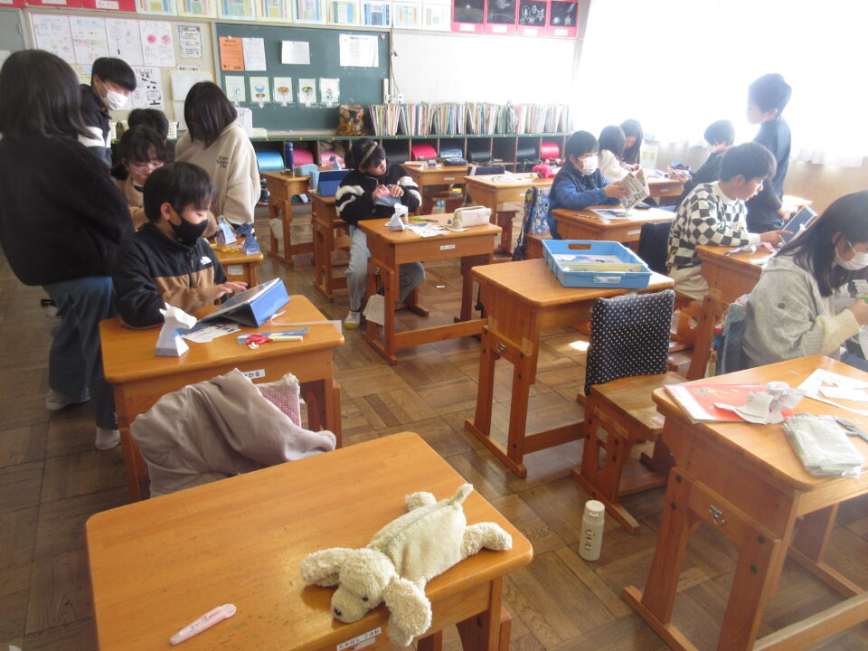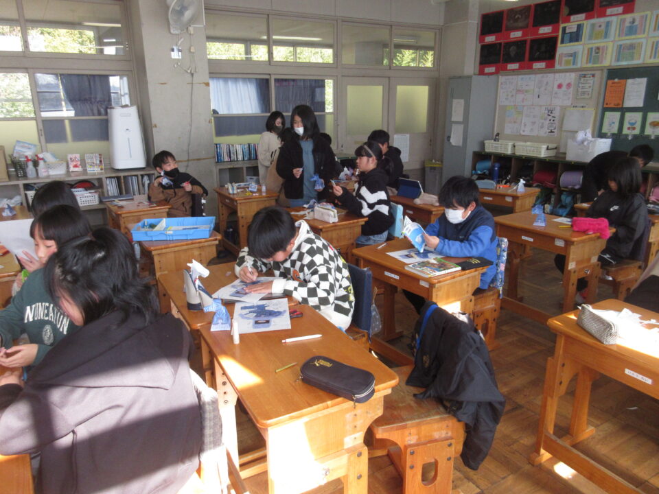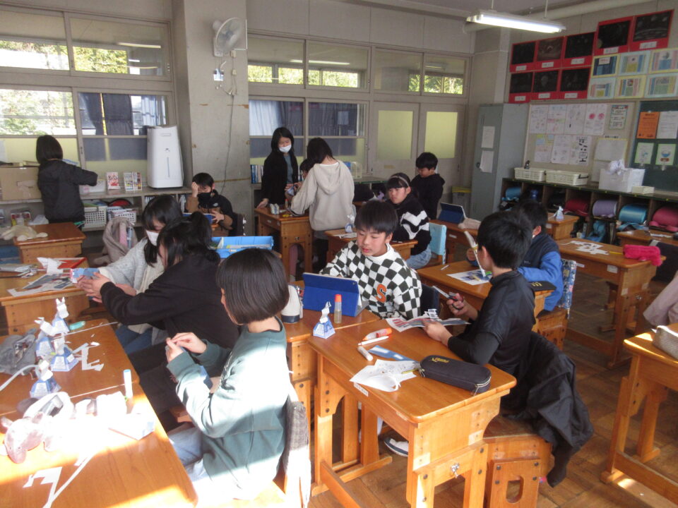 2限目に5-1を見に行くと、ペーパークラフトに挑戦していました。下絵が描いてあるシートを点線で切り取り、組み立てていくものです。やまおり、たにおりがわかりにくく、切り取ったけど組み立てられない、わからないとあきらめモードになる感じの子もいました。それでも見本と同じように完成させる子もいました。