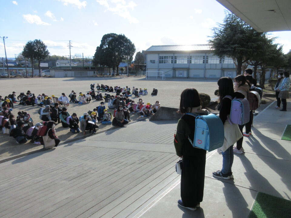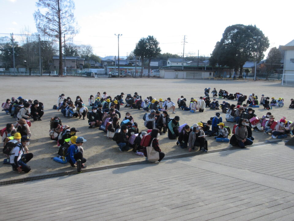 一斉下校は、ご覧のように通学団別に運動場に整列します。いつも児童会役員が皆の前に立って、司会をします。