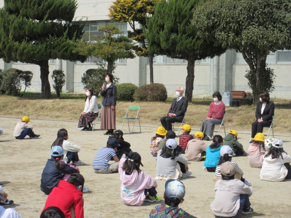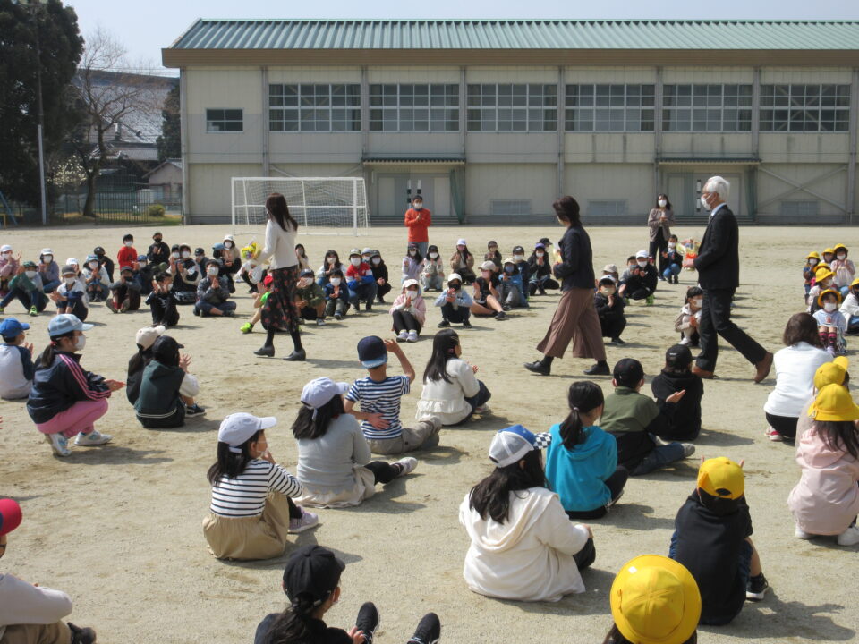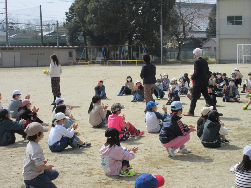 学年の卒業式(修了式)の後は、先生方の卒業式(離任式)を行いました。3月をもって射和小学校とお別れする先生方から最後のメッセージをいただきました。子どもたちは、大きな拍手で先生方に感謝の気持ちを伝えました。運動場は、昨日までの慌ただしく駆け抜けてきた時間が一瞬止まったような光景になりました。とても寂しい季節です。