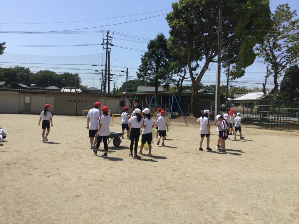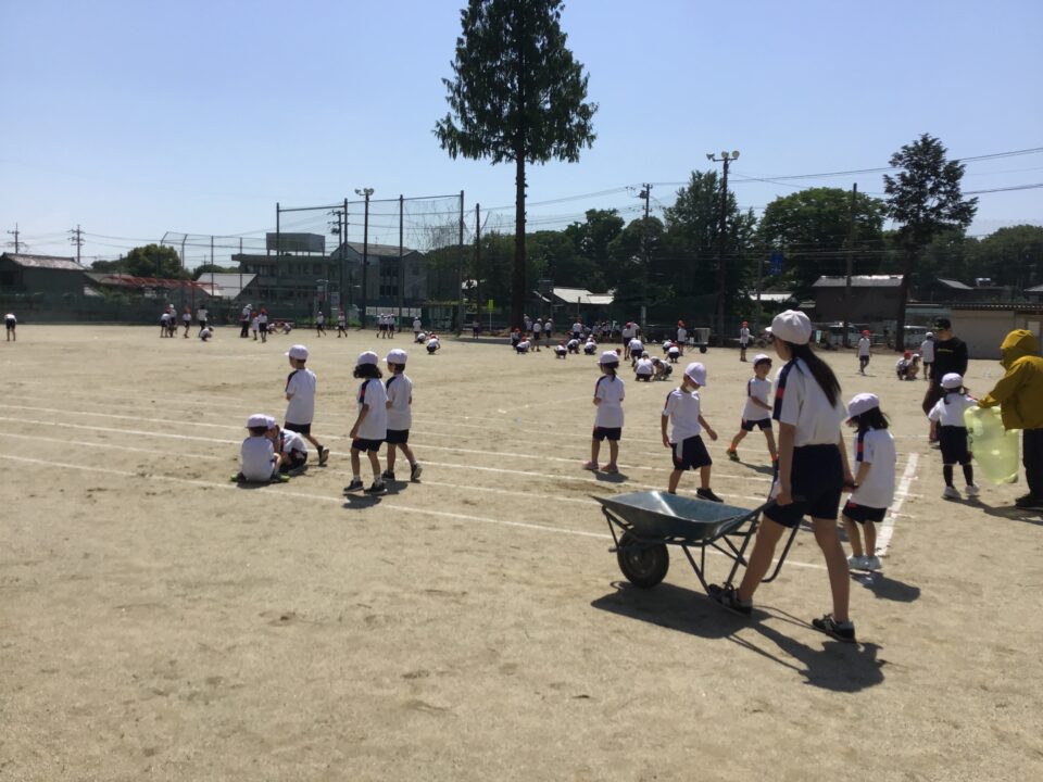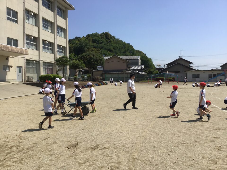けがをしないように、運動場の石拾いをしました。もし、遊んでいて気づいたら、拾っておいてください。