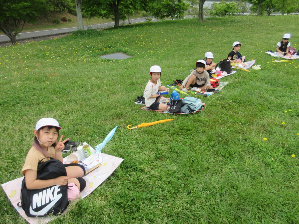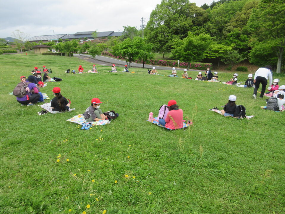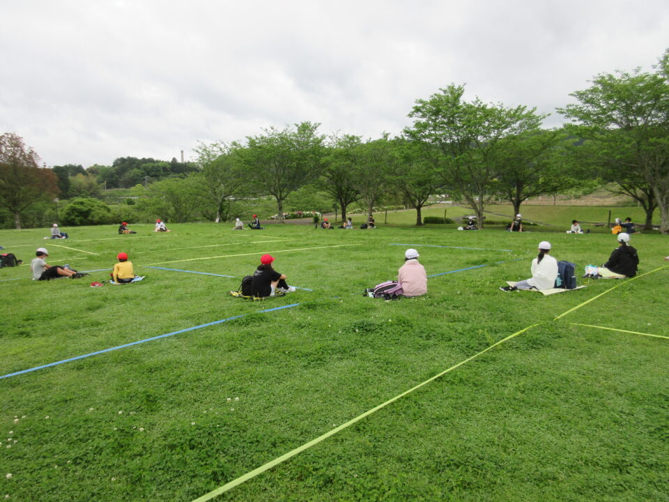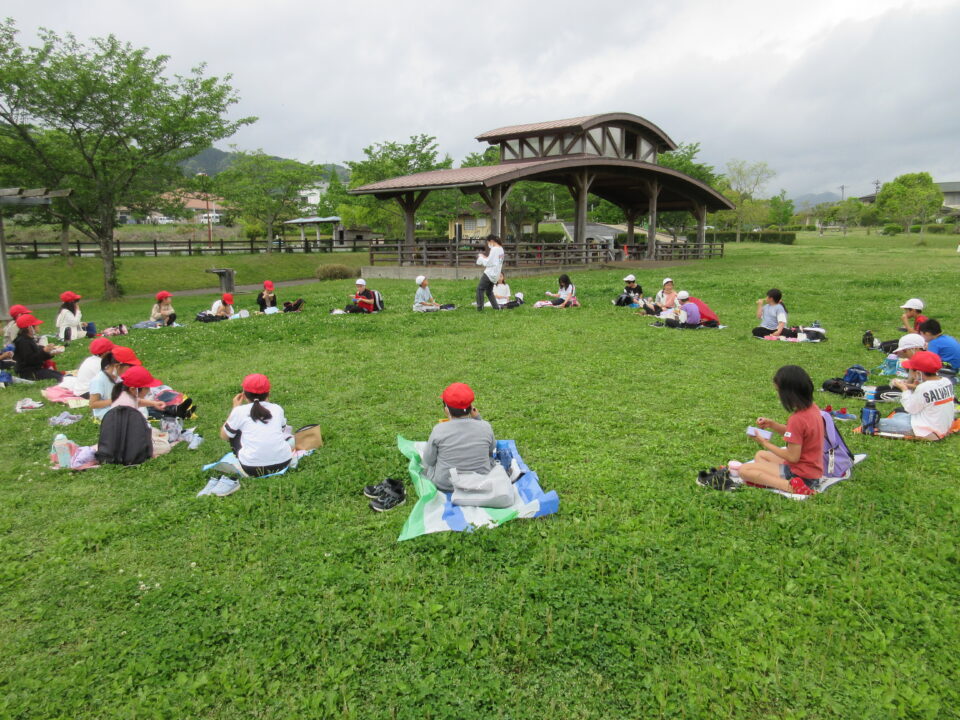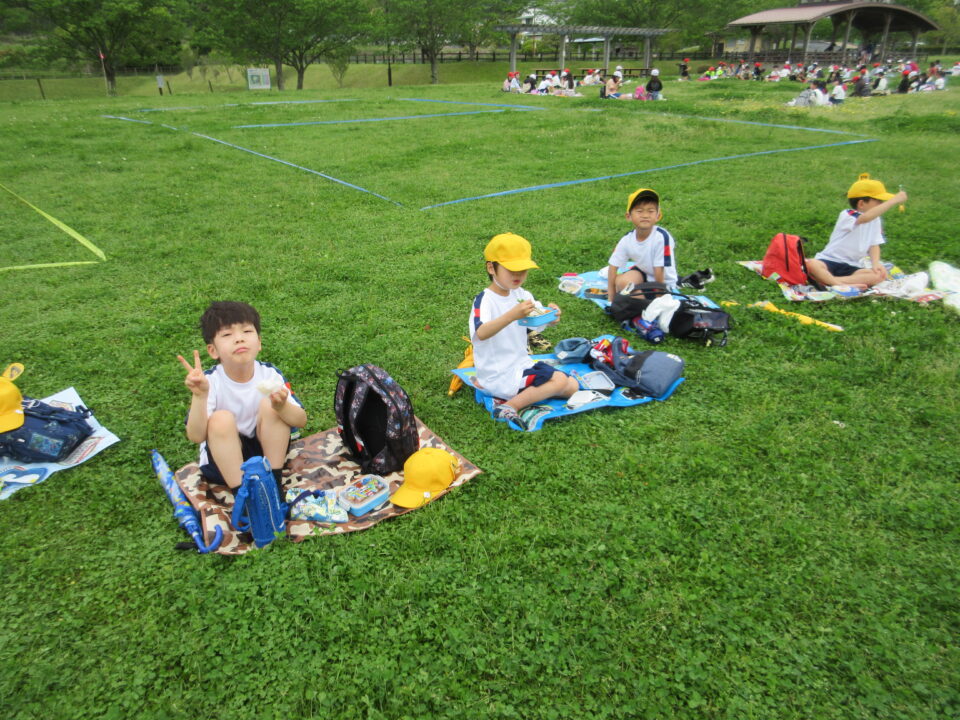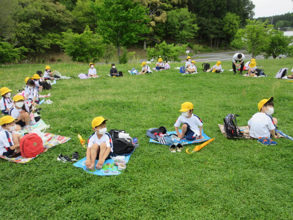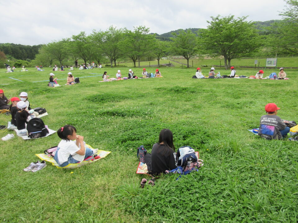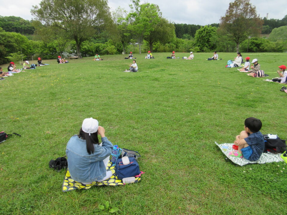 楽しいお弁当タイムは、感染症対策のため、なかよし斑ではなく、学年で大きな輪を作り食べました。緑でいっぱいの広場に6つの大きな輪ができました。