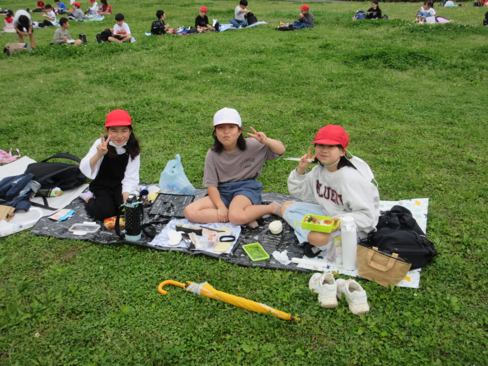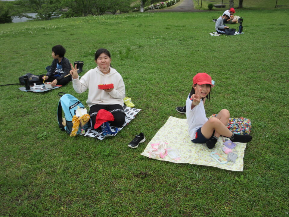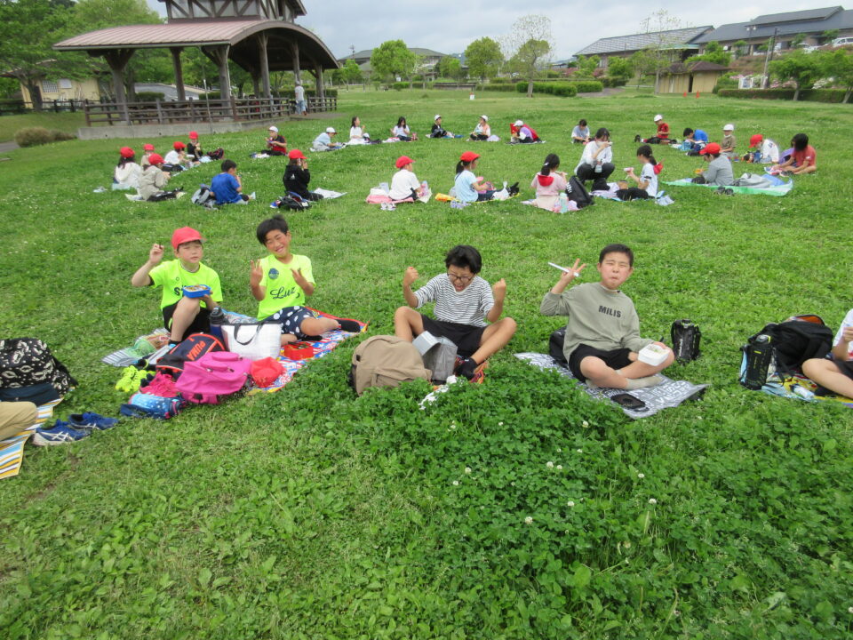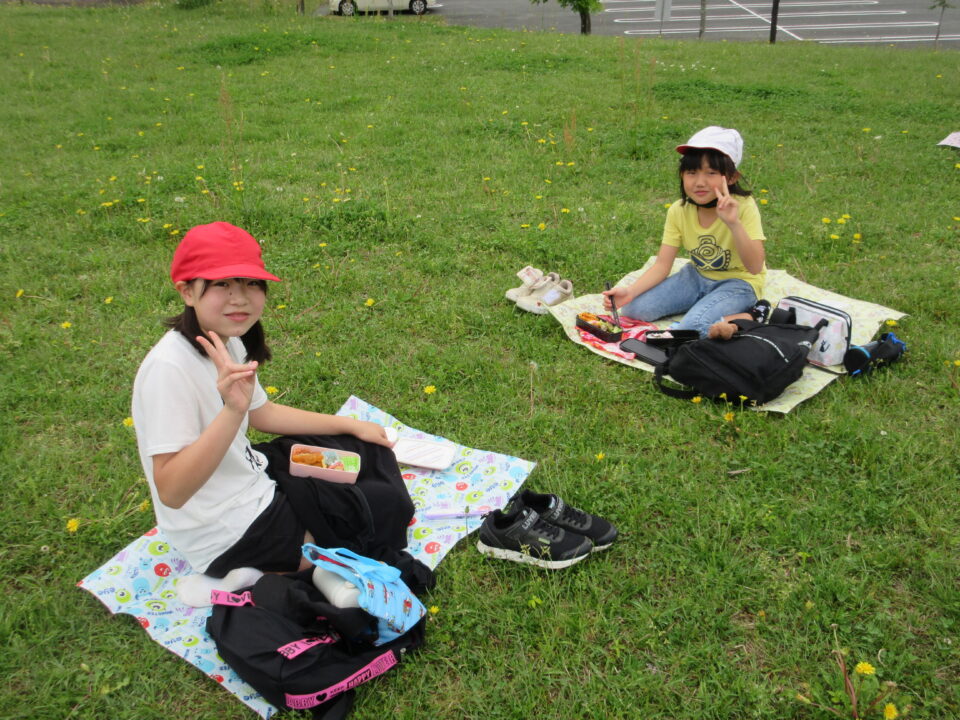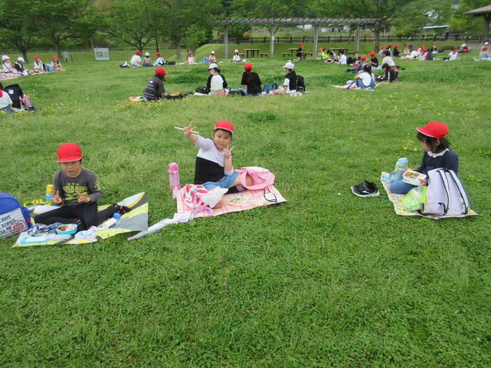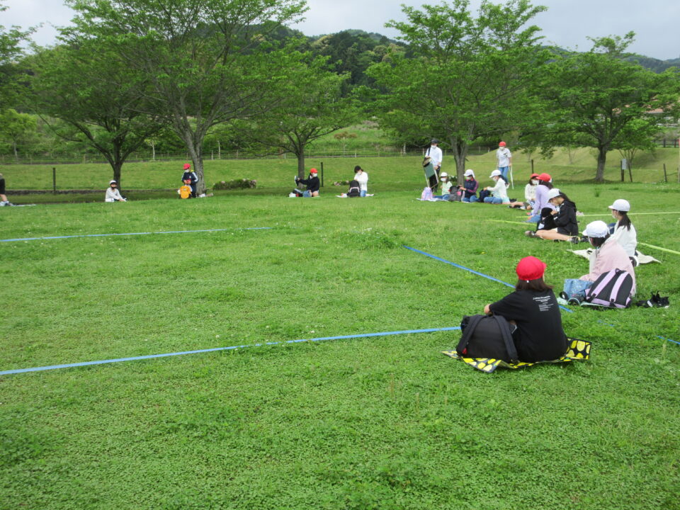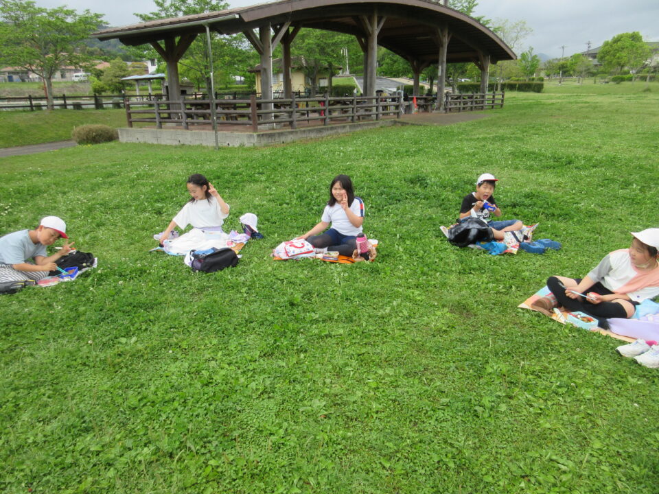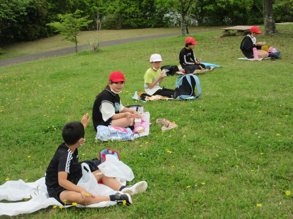 楽しいお弁当タイムは、感染症対策のため、なかよし斑ではなく、学年で大きな輪を作り食べました。緑でいっぱいの広場に6つの大きな輪ができました。