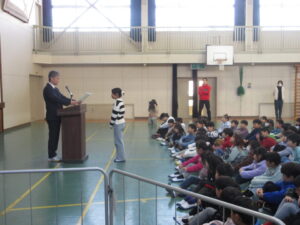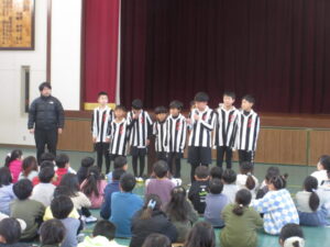 今日から学校が再開です。今日は冬休み明け集会の中で、表彰伝達と今週末に行われる小学校サッカー大会の壮行会を行いました。