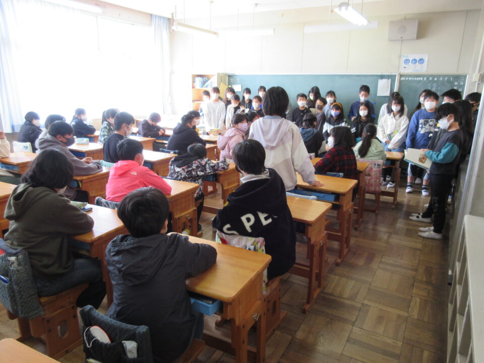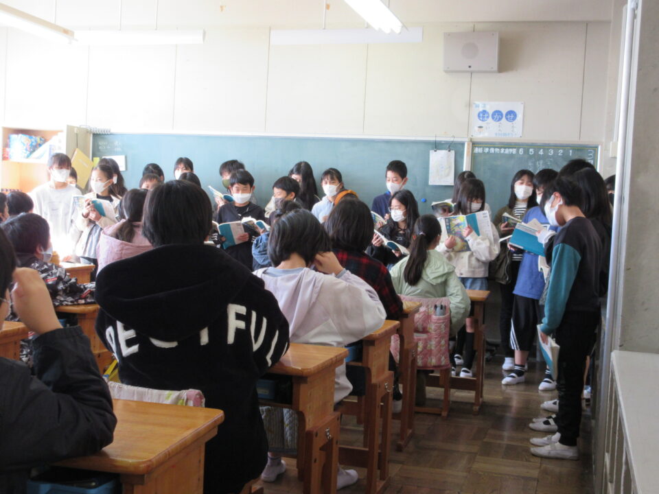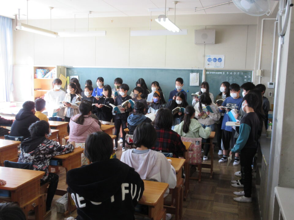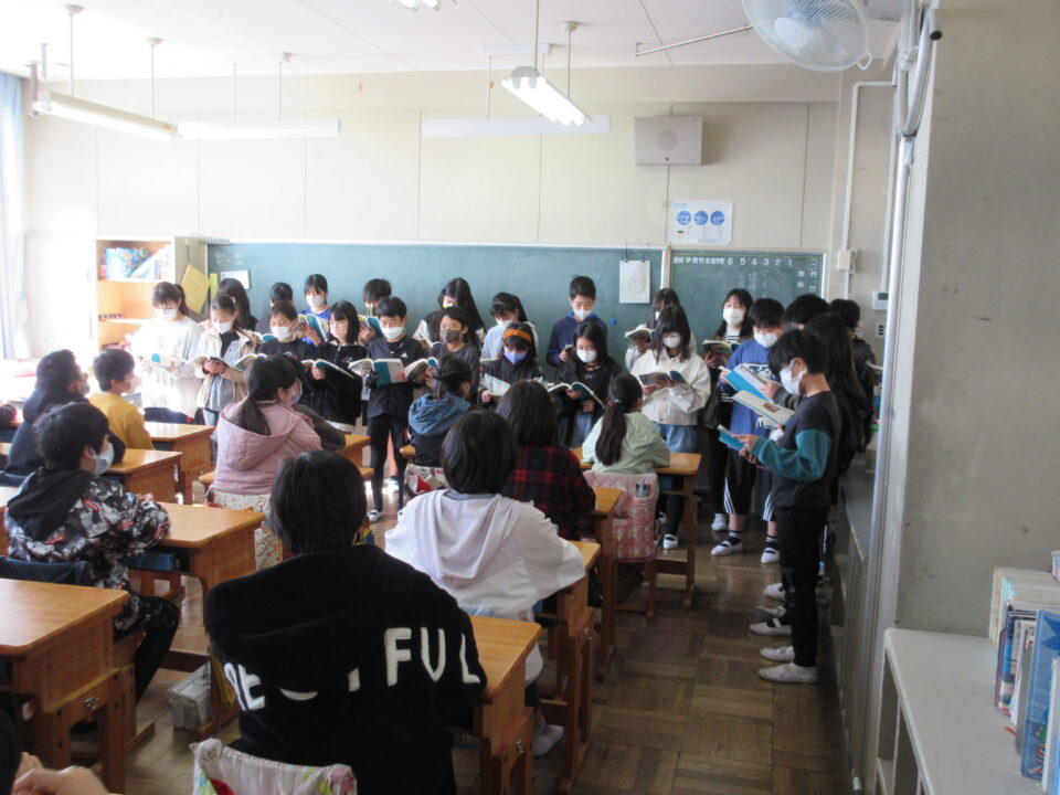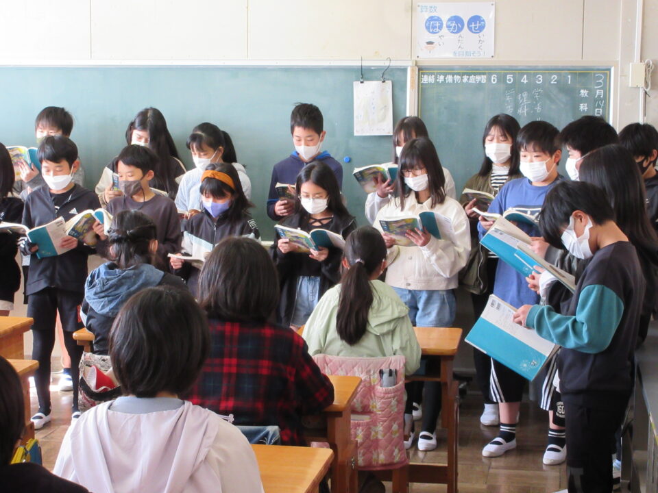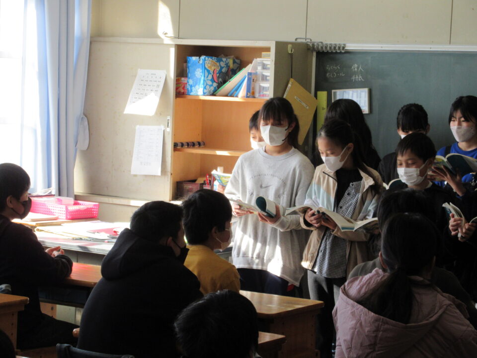 先日、5年生は6年生の朗読を参観しました。刺激を受けた5年生は、その後何度も「大造じいさんとガン」の朗読の練習を行いました。今日は、5年生が6年生教室に出向き、自分たちの朗読を6年生に聞いてもらいました。緊張した中での朗読です。この1年間、5年生は6年生の背中を追っかけて、たくさんのことを学びました。6年生にとっても、5年生から多くの刺激を受けて成長してきました。最後の最後まで、お互いにとって、とても素敵な時間になりました。