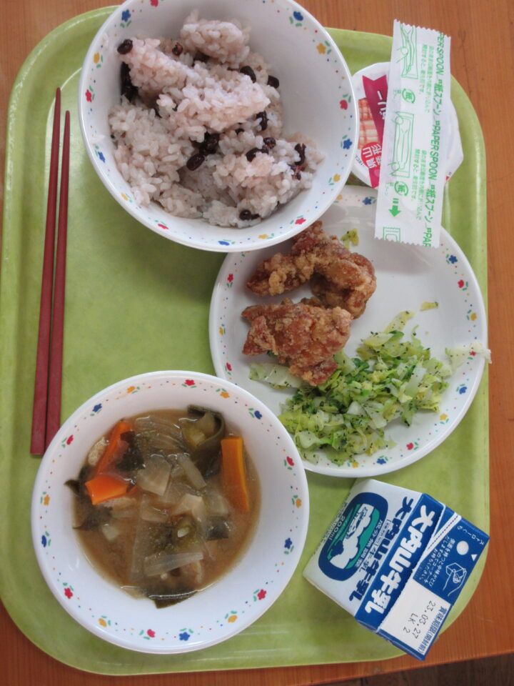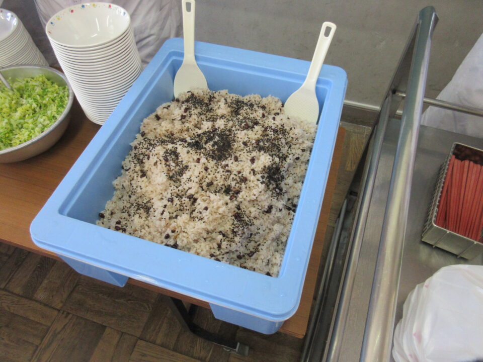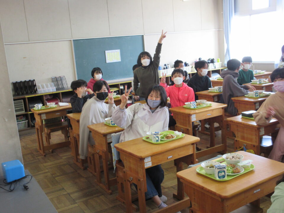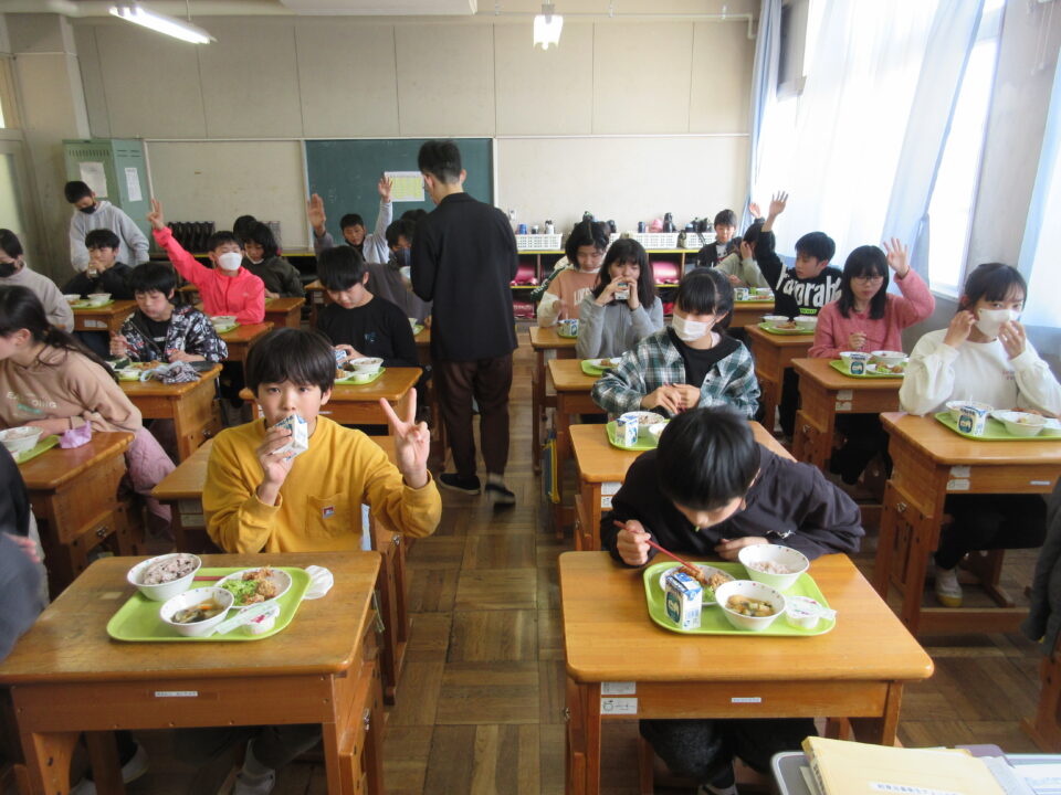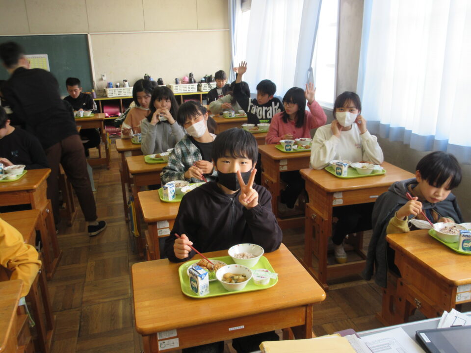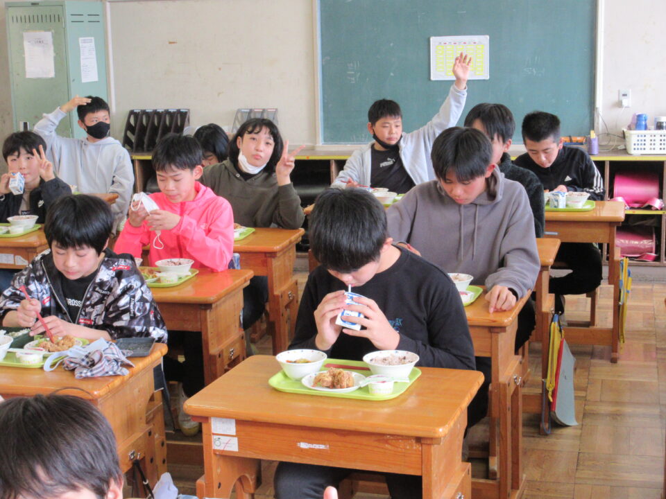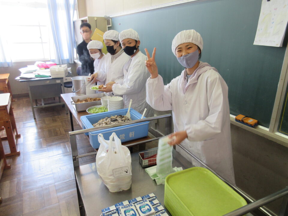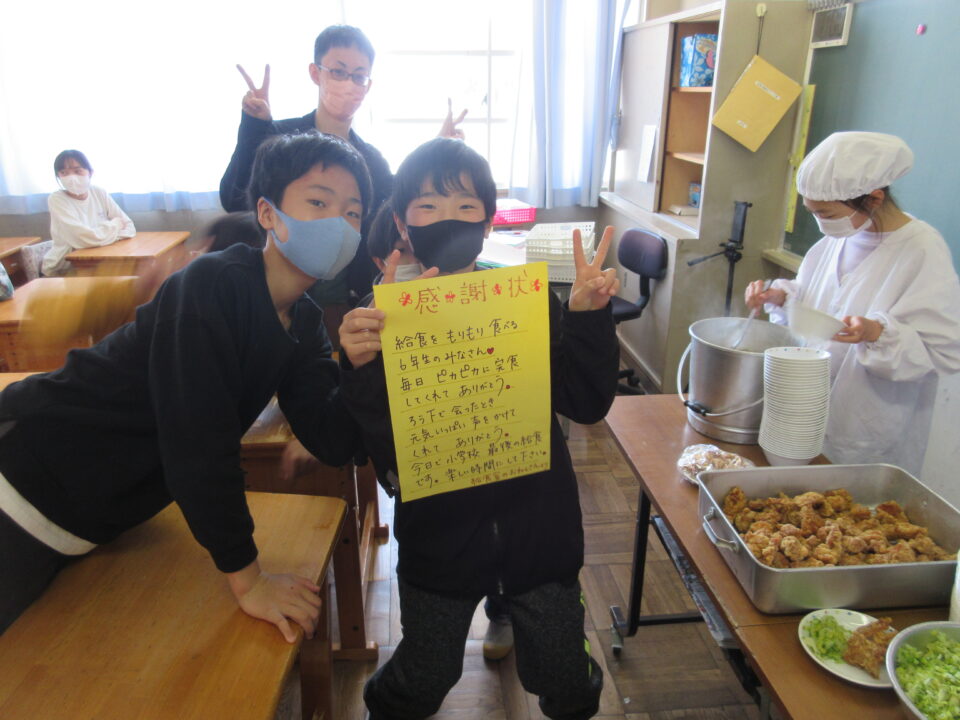 今年度最後の給食です。6年生は小学校生活最後の給食です。教室には調理員さんから「6年間、いっぱい給食を食べてくれてありがとう!」という感謝状まで届いていました。今日のメニューは、卒業をお祝いする赤飯です。名残惜しいです。今日も黙食ですが、表情は笑顔です。