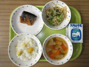今日は10月の「和食の日」です。今日の献立は、栗ご飯、牛乳、さばの煮付け、チンゲンサイの和え物、お月見汁です。十五夜にちなんだ行事食の献立です。中秋の名月は、里芋ができる時期でもあるので、芋名月とも言われています。今日の「お月見汁」には、芋名月にちなんで里芋が入っています。今日もおいしくいただきました。