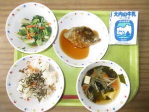 今日は今年度最後の「和食の日」です。今日の献立は、ひなちらし、牛乳、さわらの照り煮風、いかとわけぎのぬた、すまし汁です。昔からお寿司は、お祝いの席で食べる食べ物とされてきました。華やかなちらしずしは、ひな祭りを祝うのにぴったりです。明日3月3日はパンの日なので、一日早く登場しました。健やかな健康に感謝しながら、おいしくいただきました。