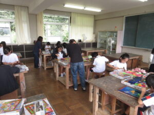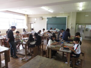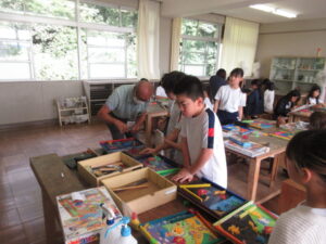 4年生の図工で、コリントゲームを作っています。このコリントゲームを作るには、金づちでたくさん釘を打たなければなりません。そこで、4人のサポーターの方に来ていただき、釘の打ち方を教えていただいたり、ケガをしないように見守りをしていただいたりしました。支援をしていただくことで、上手く作業が進みました。サポータのみなさん、いつもありがとうございます。
