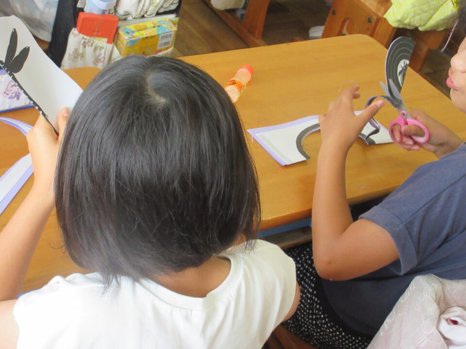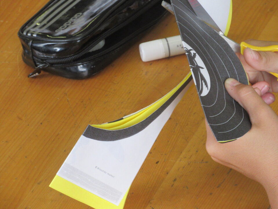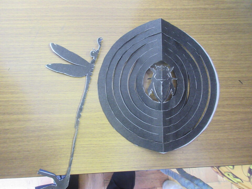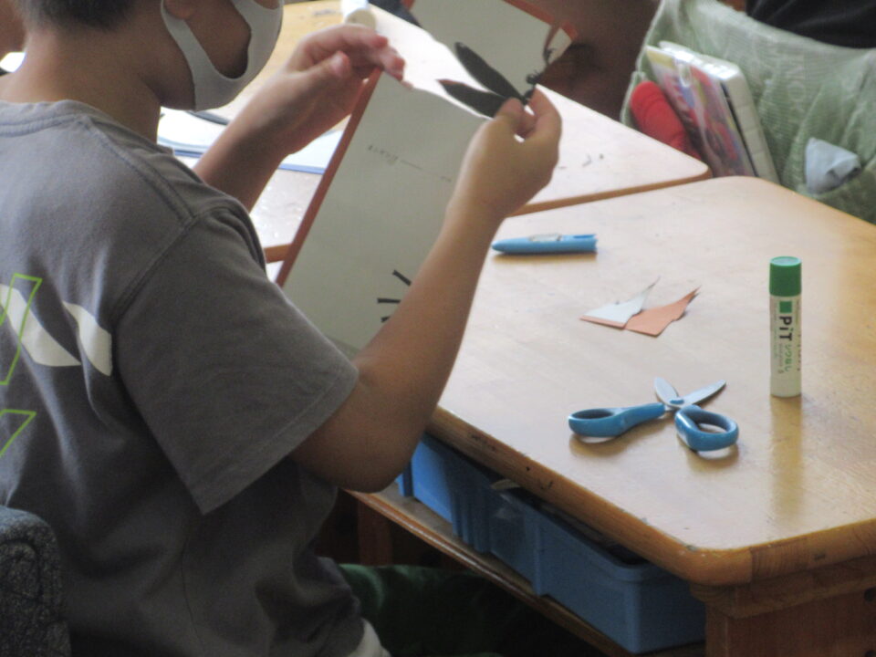 4年生の図工です。トンボとゲンゴロウの切り絵でした。どちらかの絵を選んではさみで切り抜いていきます。とっても細かい部分もあり、なかなかうまくいきません。さすがに慎重に集中しながら取り組んでいました。