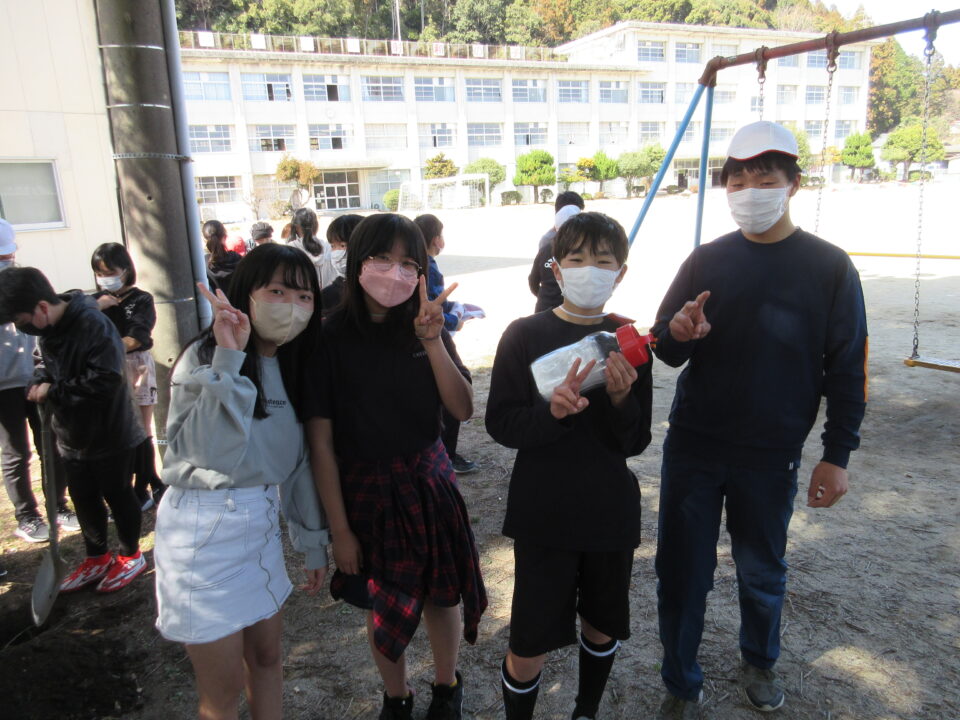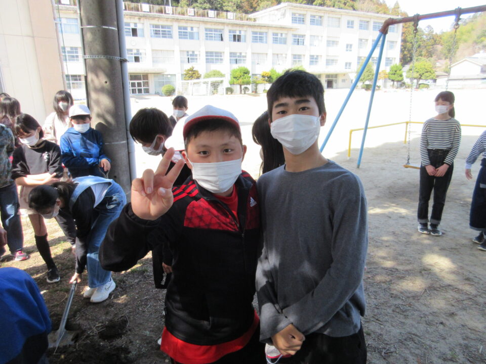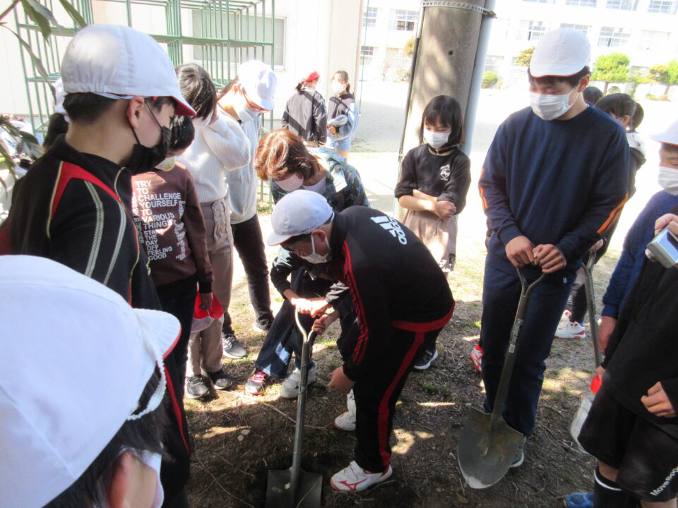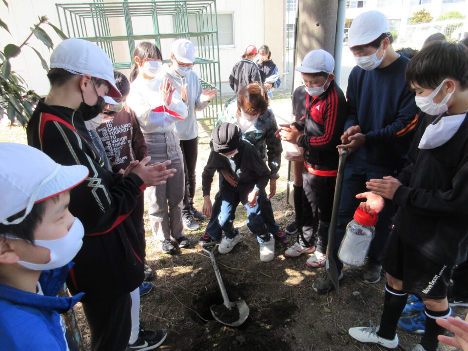 6年生が卒業を前にタイムカプセルを埋めました。カプセルの中身は将来の自分への手紙と、今の集合写真です。スコップで穴を掘り、未来の自分、そして未来の友だちとの再会に思いをはせて埋めました。