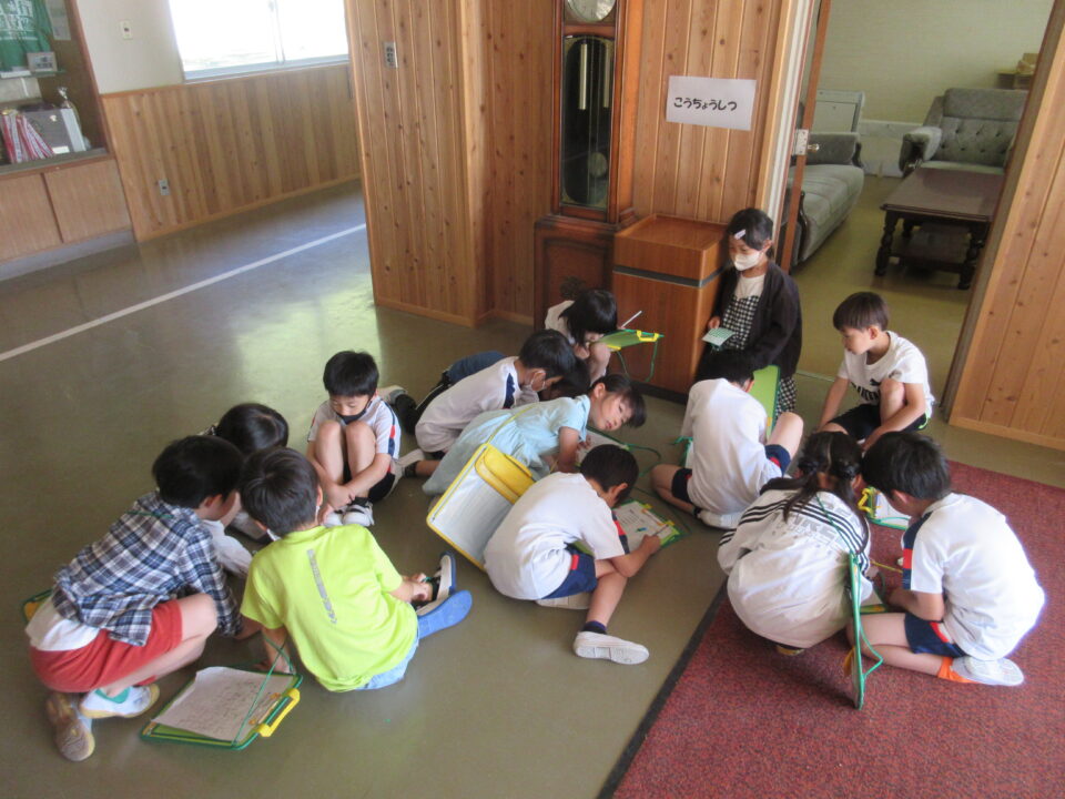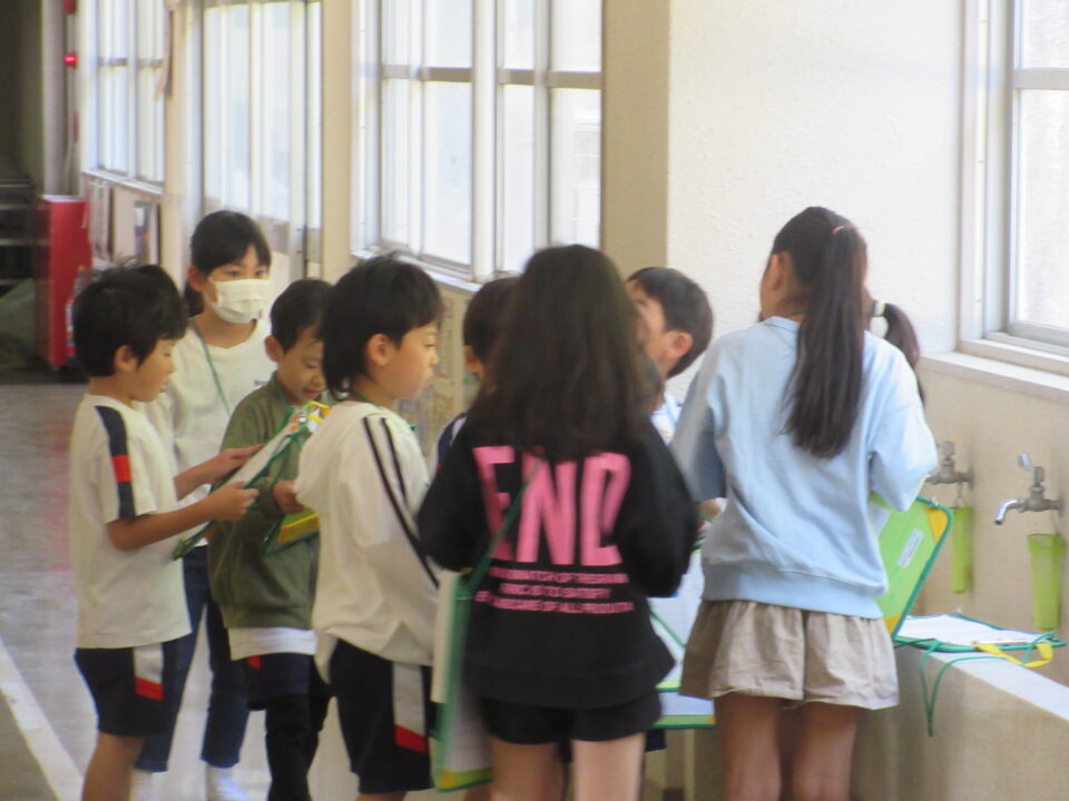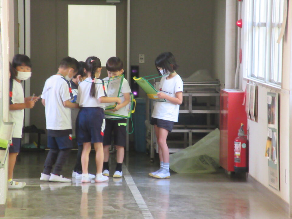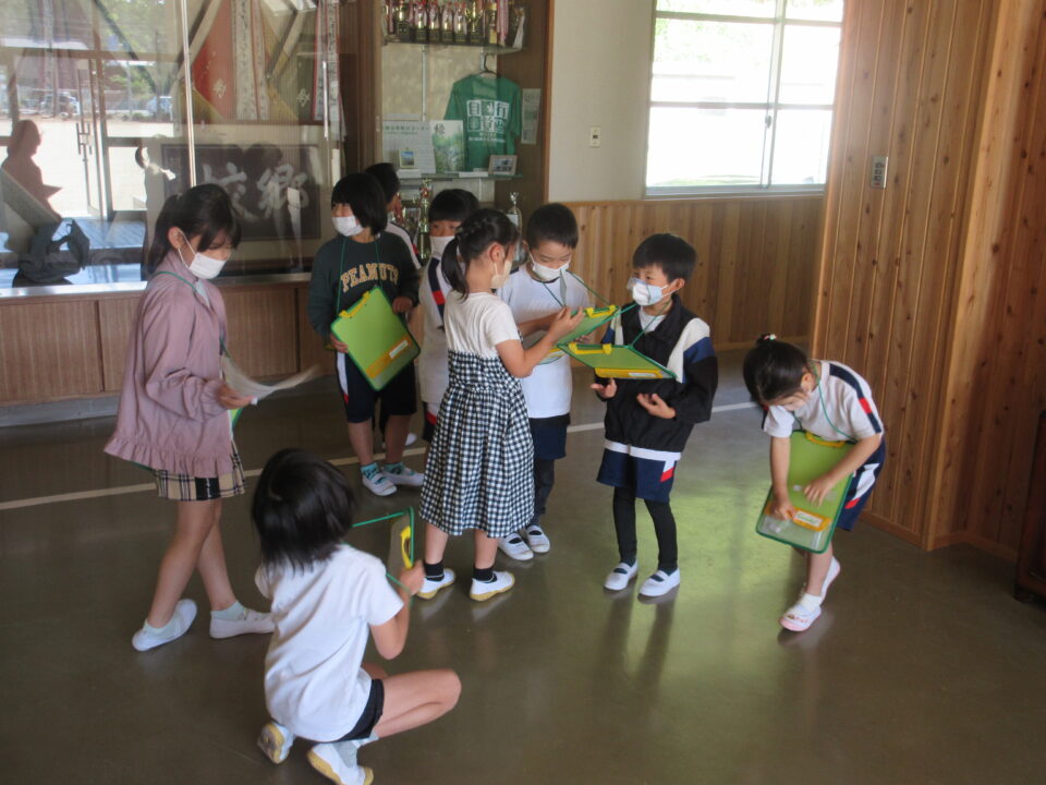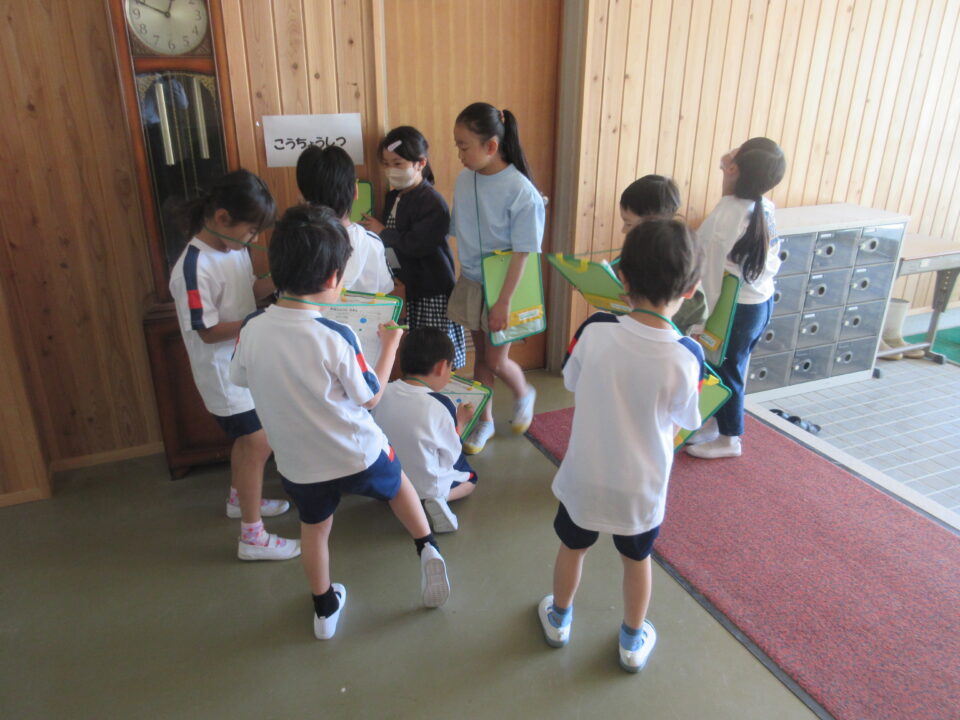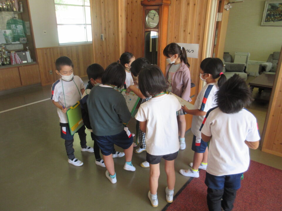 今日は1年生の学校探検がありました。2年生が案内しながら校長室や職員室、保健室等を案内し、2年生の担当者から説明をします。クイズもありました。行った先でシールをシートに貼ってもらいました。