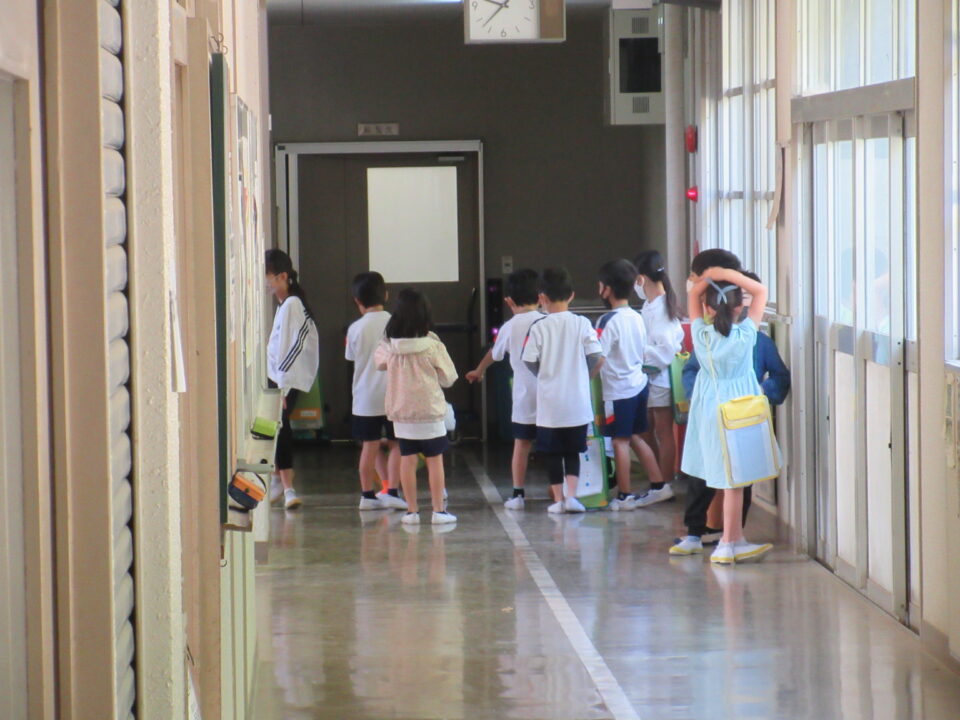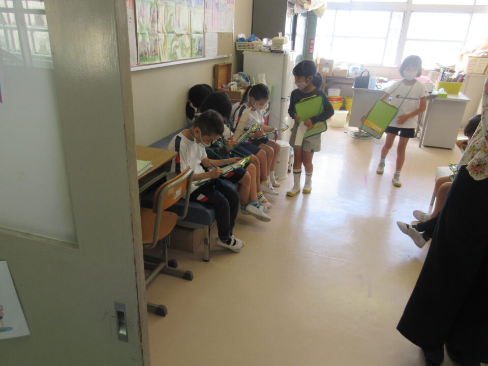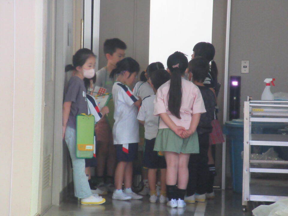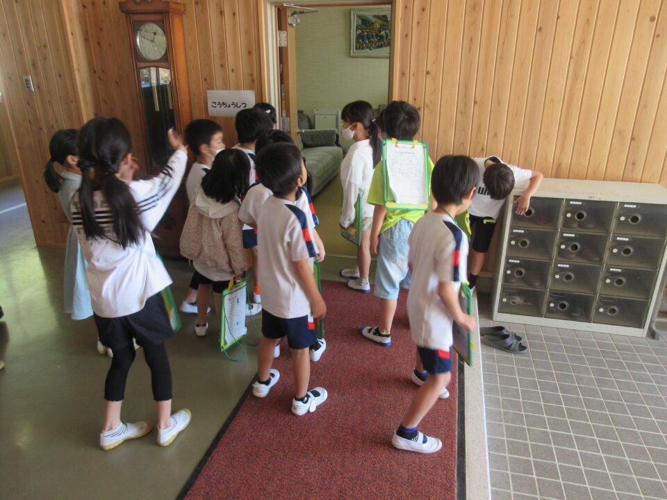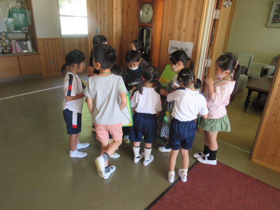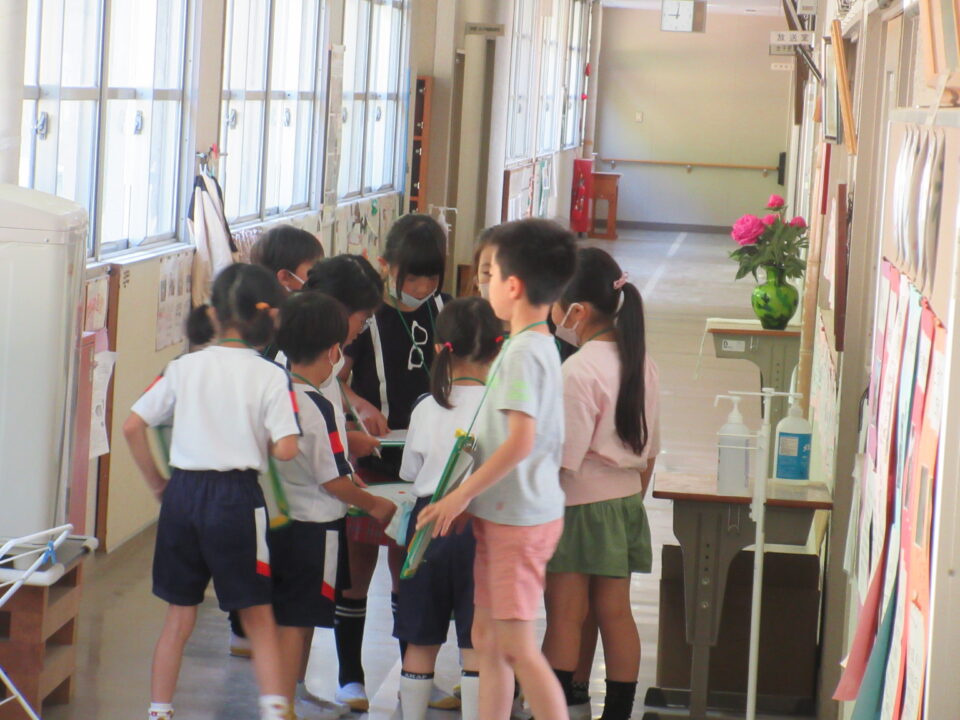 今日は1年生の学校探検がありました。2年生が案内しながら校長室や職員室、保健室等を案内し、2年生の担当者から説明をします。クイズもありました。行った先でシールをシートに貼ってもらいました。