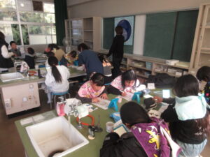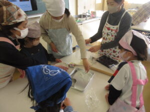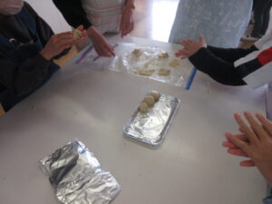 今日も第四小学校の栄養教諭である中野先生に来ていただき、学習ルームと6年生の子どもたちが教えていただきました。3・4限目には、学習ルームの子どもたちが、中野先生と一緒に「チョコチップ入りスノーボール」を作りました。