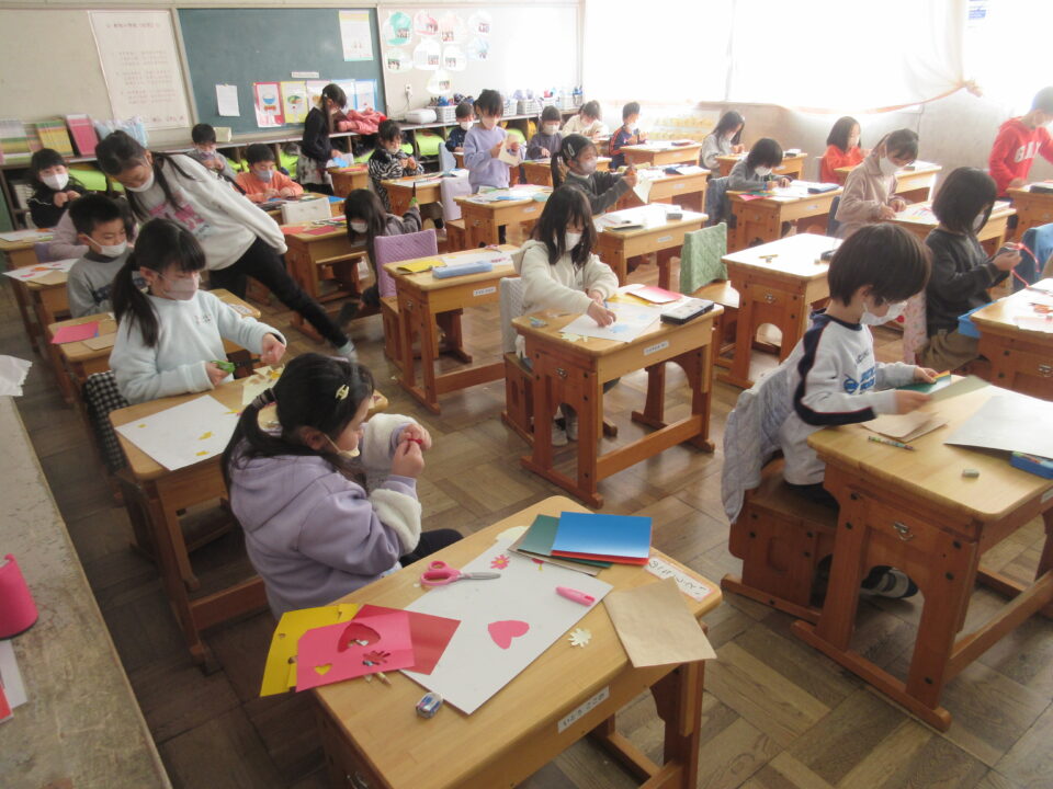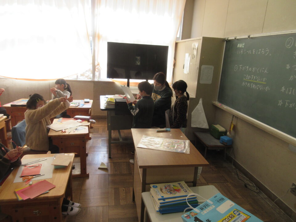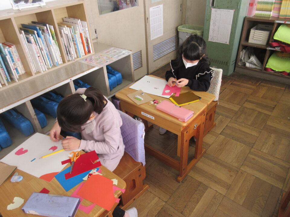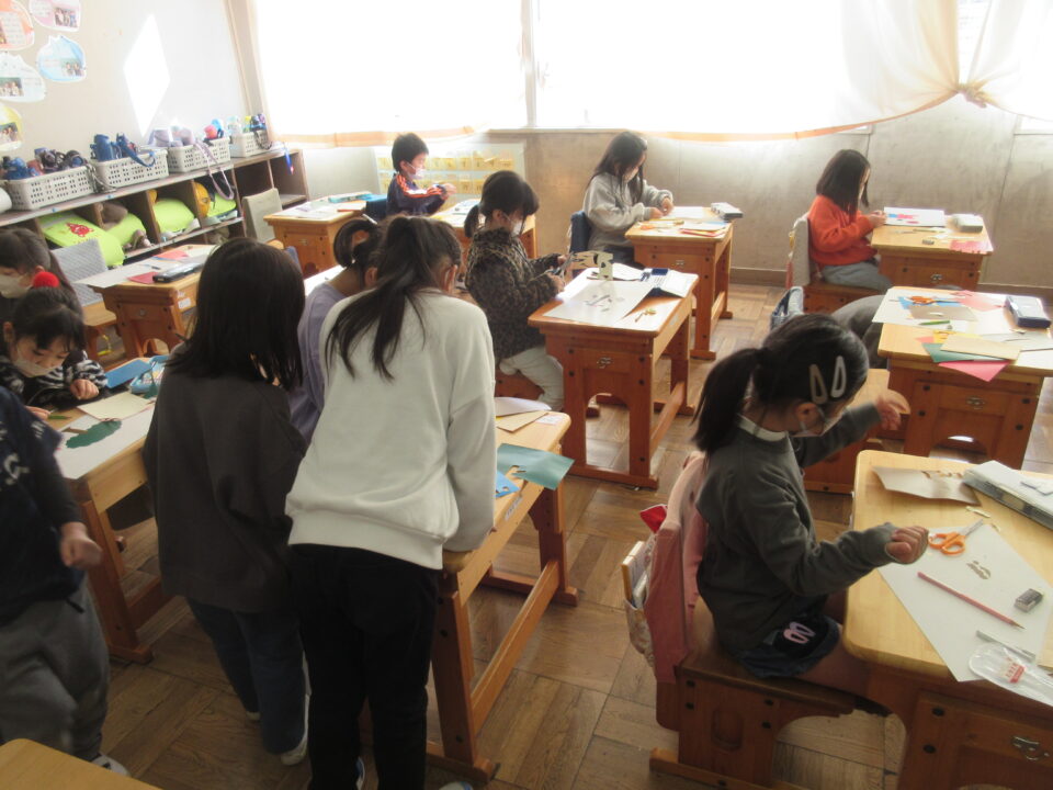 1年生の図工の時間です。紙版画に挑戦しています。色画用紙を丁寧に切って貼り付けていきます。細かい作業にもしっかり取り組める1年生です。とても「集中」しています。