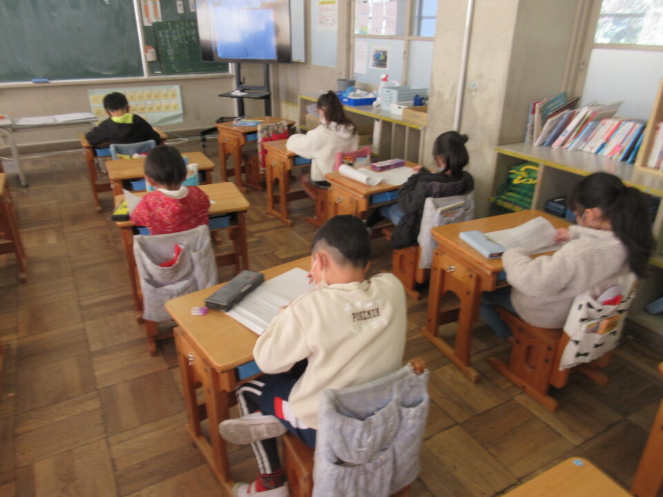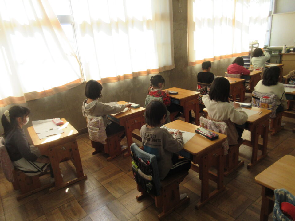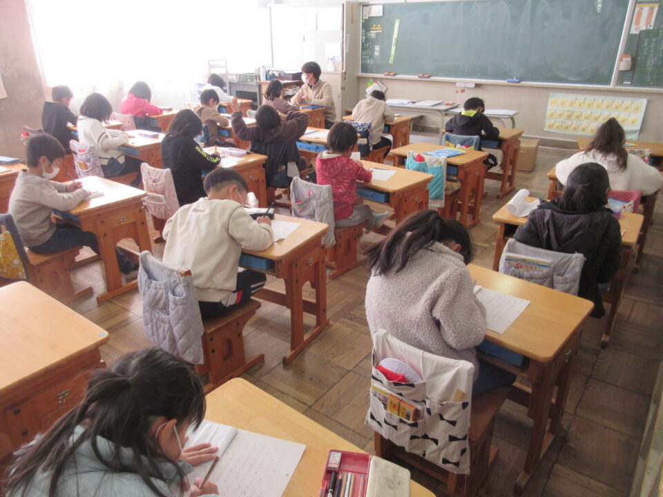 2年生は2時間かけて、「山ふところ」に挑戦しました。この1年間の思い出の作文作りです。皆、とても真剣に自分の言葉で文章を書いていました。この「集中力」は実に見事です。