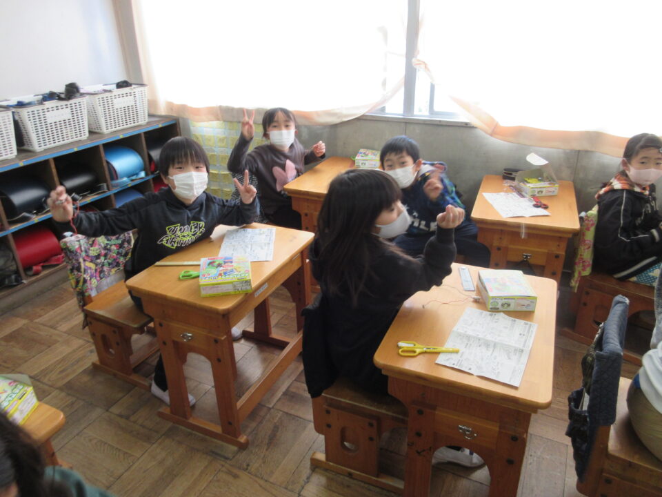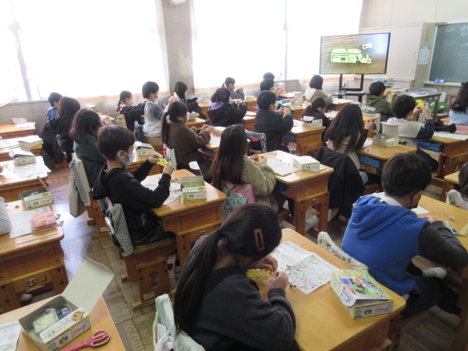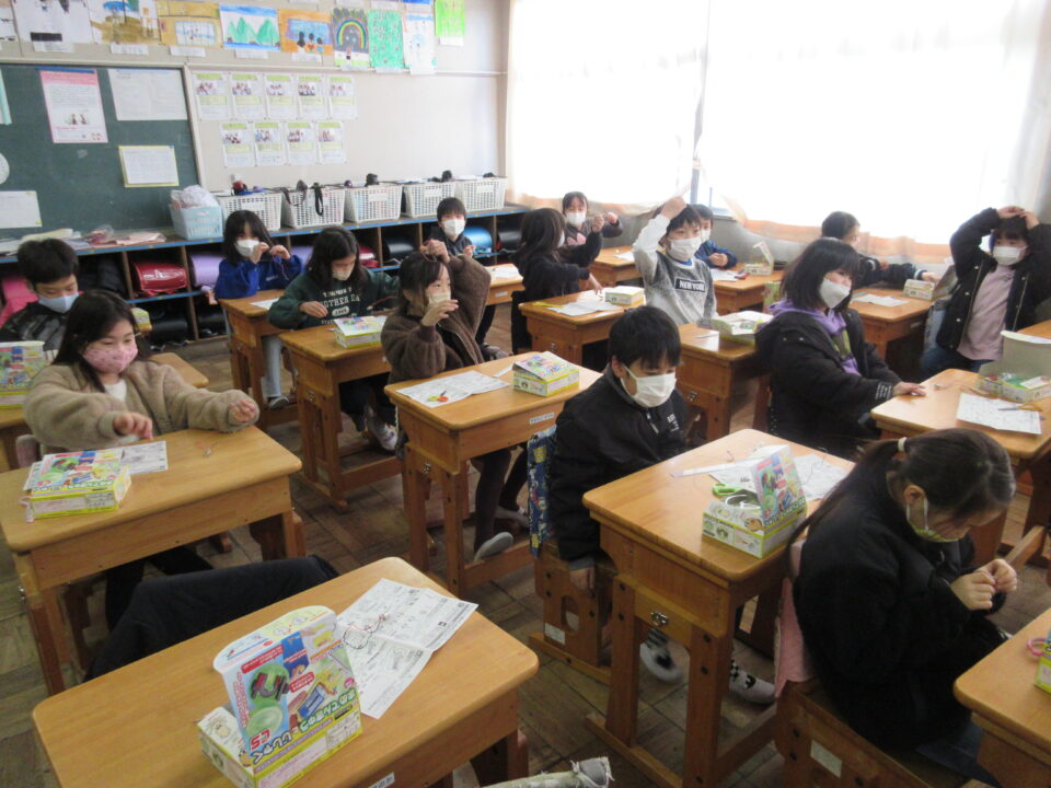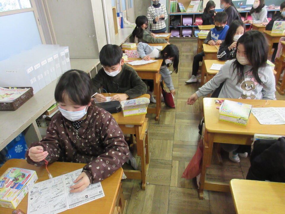 一人ひとりに実験キットが配布され、子どもたちは大喜びです。説明書を見たり、友だち同士で教え合って準備をしました。次時からの実験が楽しみです。