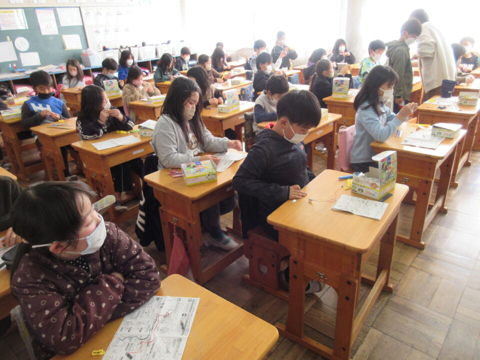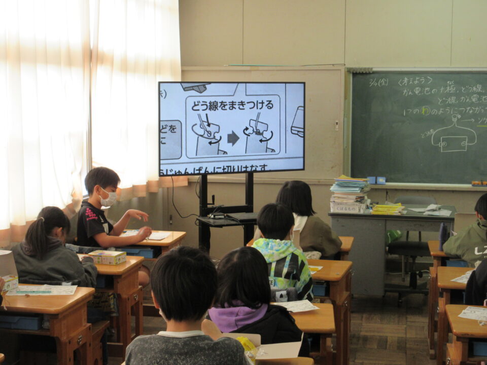 3年生の理科の時間です。「豆電球と磁石」の実験キットを使って、これから行う実験の準備をしました。
