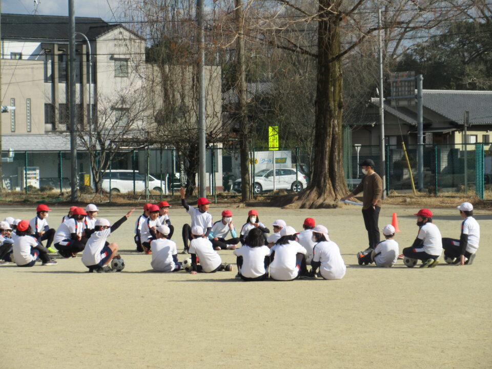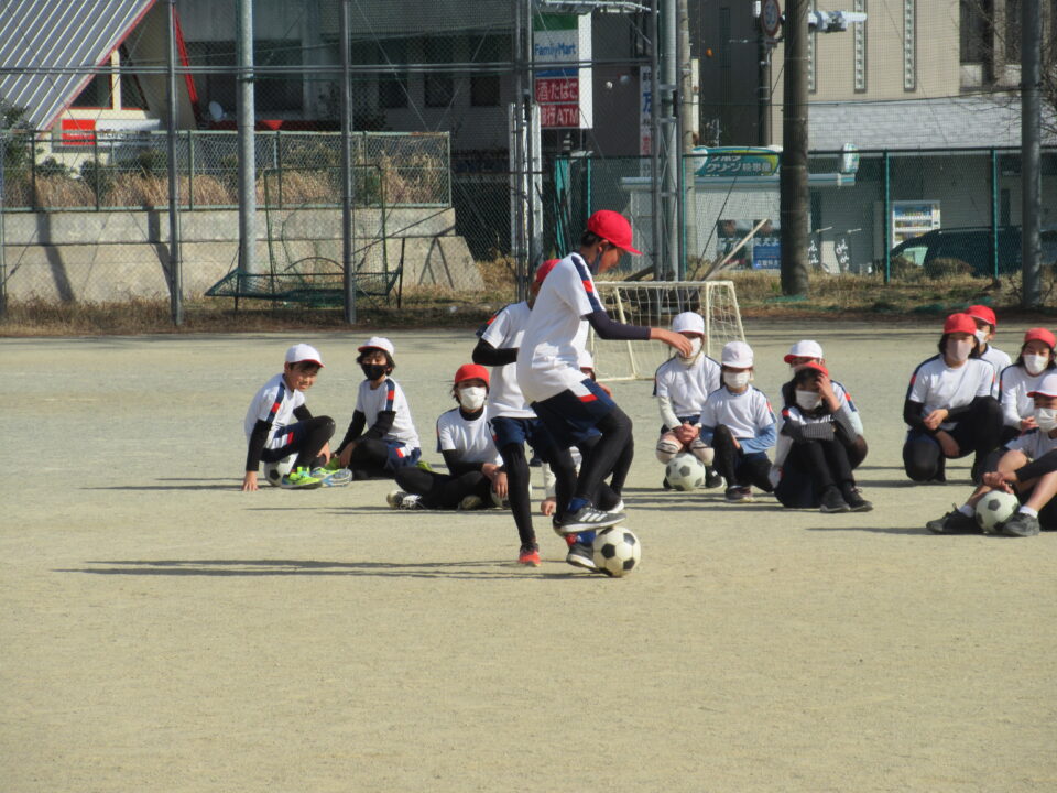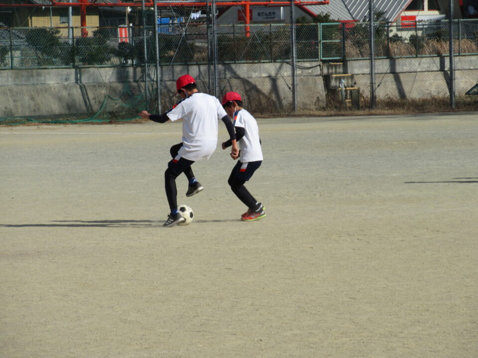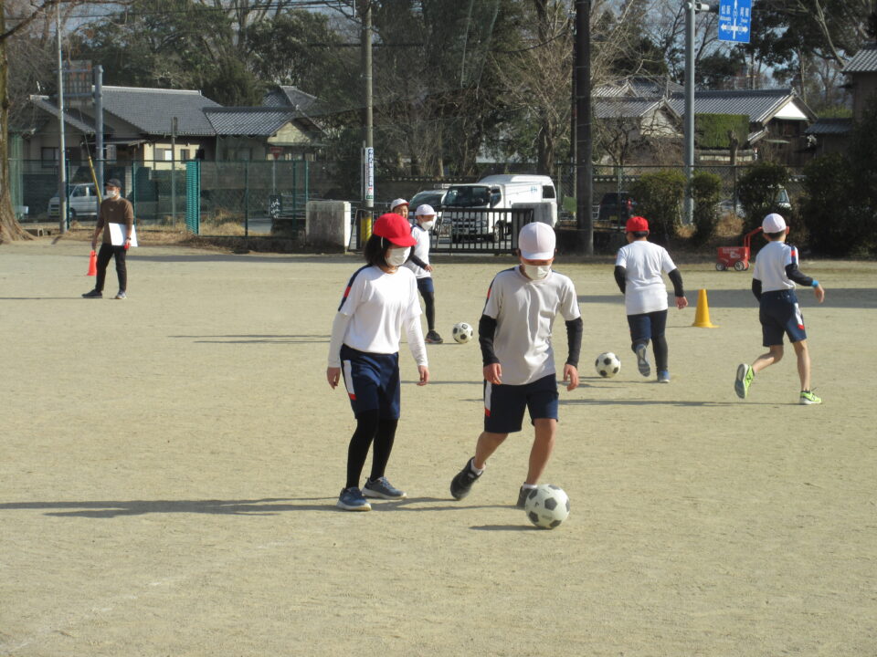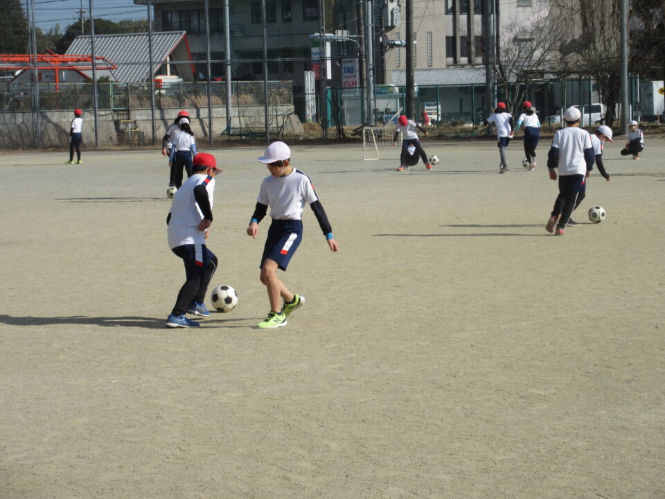 5年生の体育の時間です。運動場でサッカーを行いました。2人1組になって、相手にとられないようにボールをキープする練習です。真剣な中にも、笑顔があって、とてもいい雰囲気でサッカーを楽しんでいました。