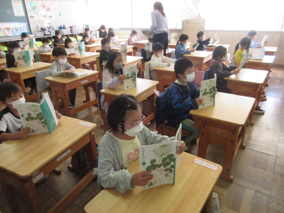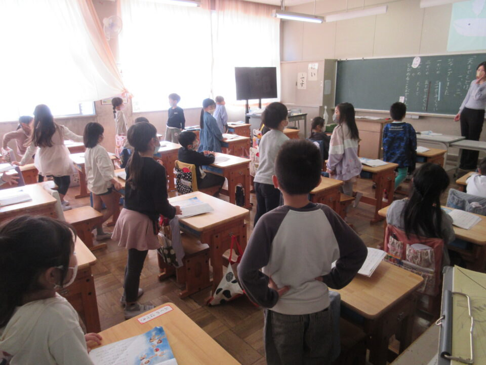1年生。国語の時間の「くじらぐも」の学習です。公開授業とし職員が参観をしました。子どもたちだけでなく、職員同士も学び合う時間です。子どもたちの考えを深めるため、授業の中に動作化を取り入れます。先生からの「どうしてとびのることができたのだろう?」という発問に、一人ひとりが自分で考えたことをしっかりと発表していました。