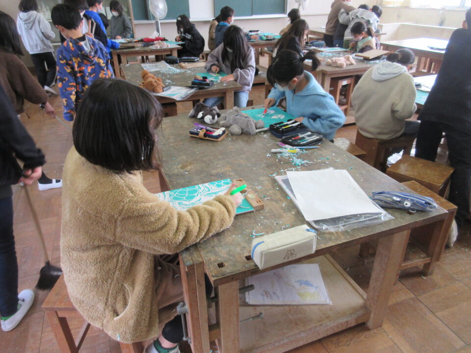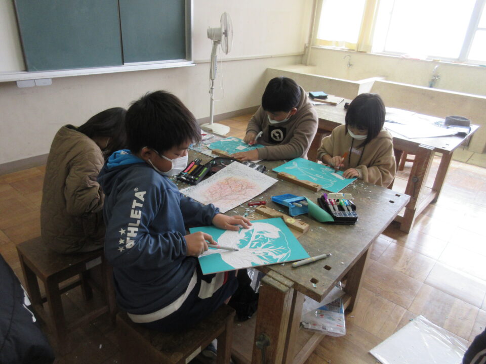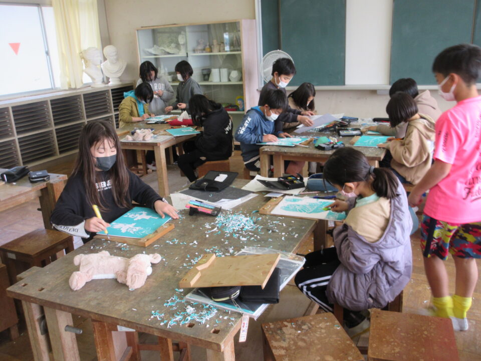 4年生は図工の時間の版画です。彫刻刀を慎重に使っています。