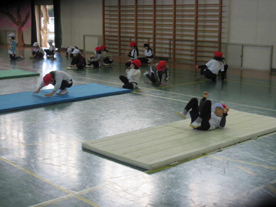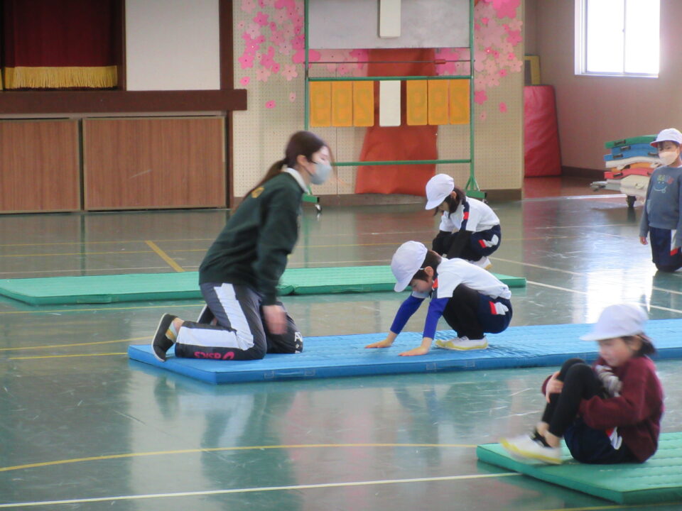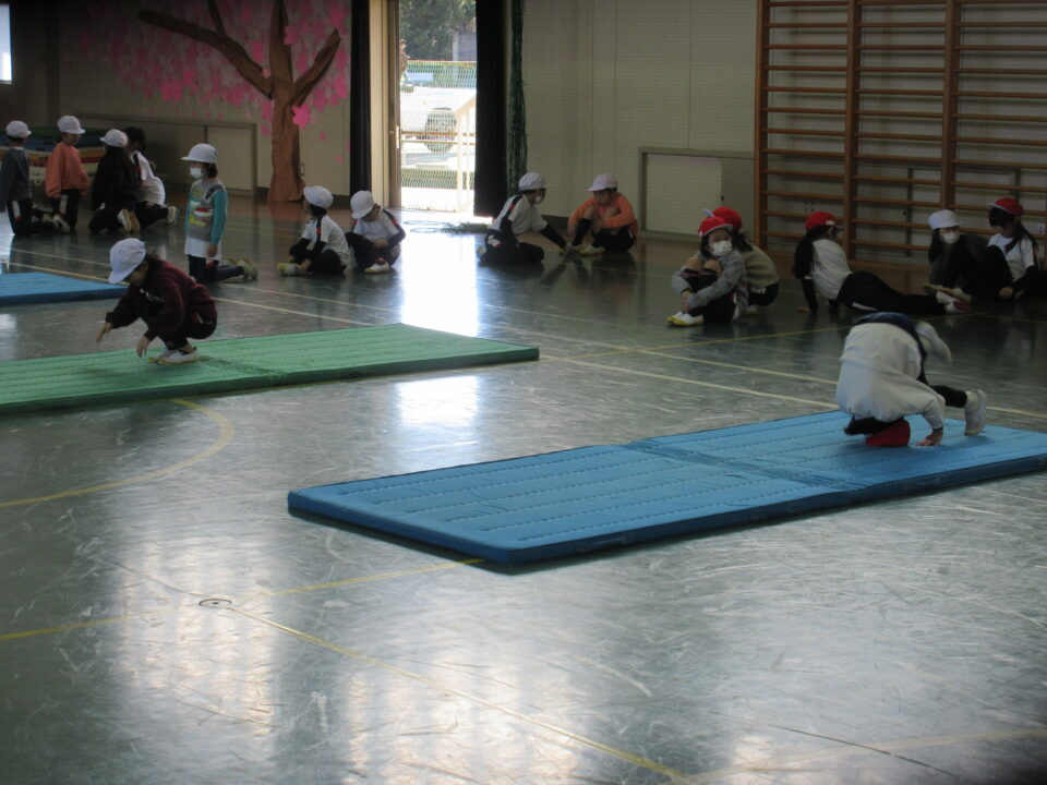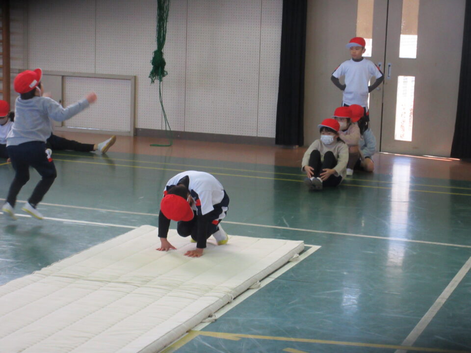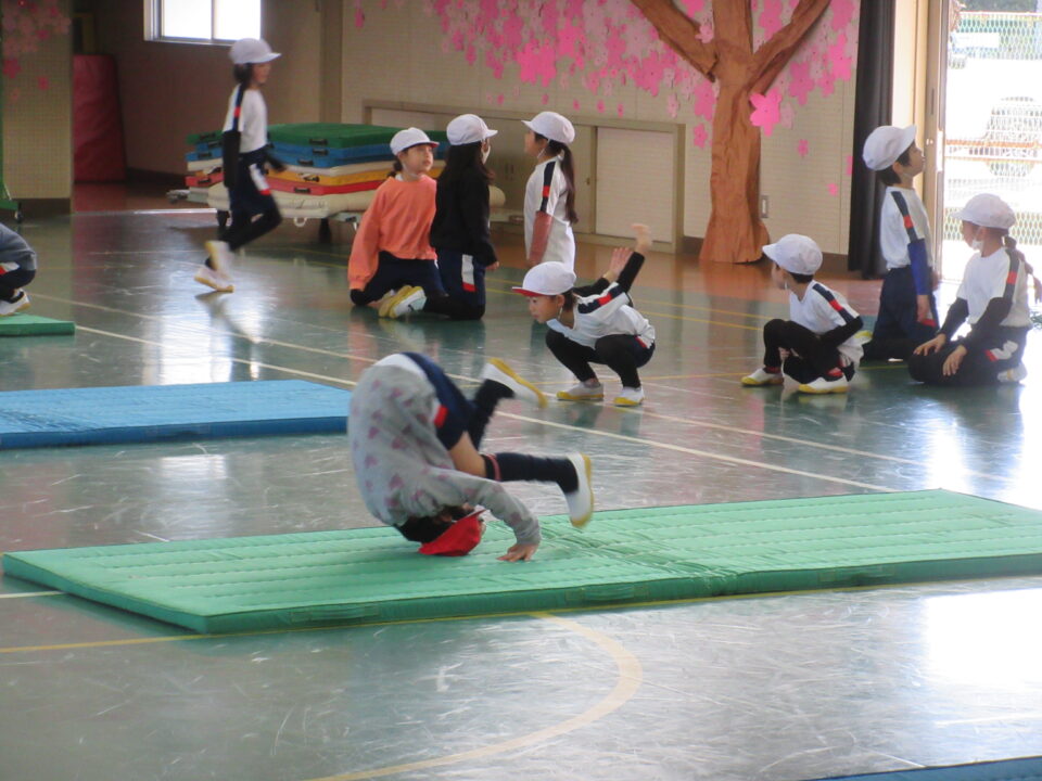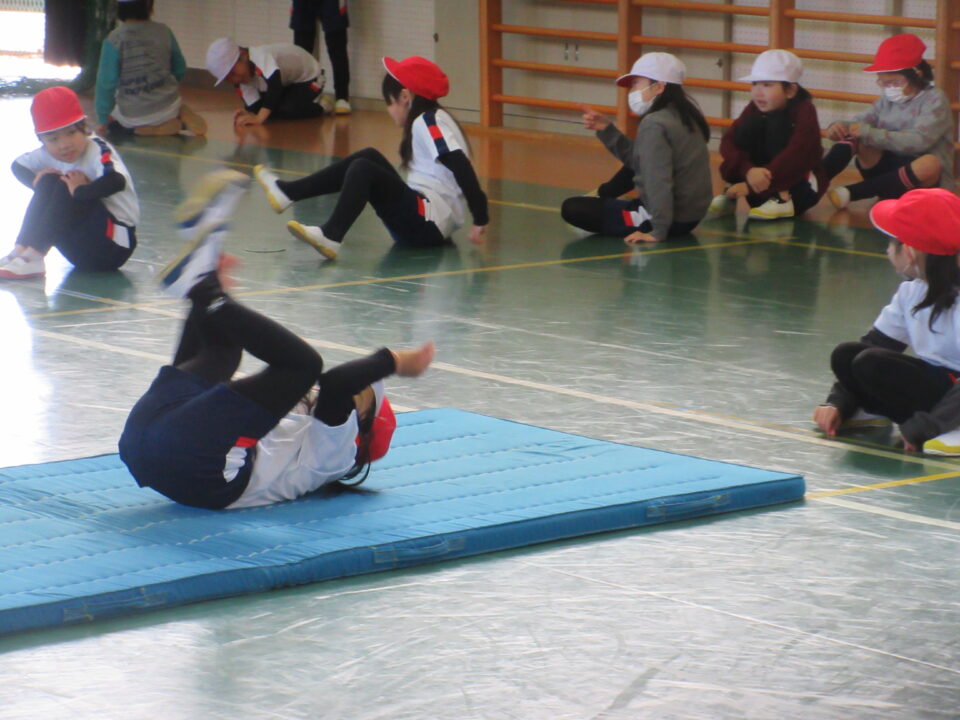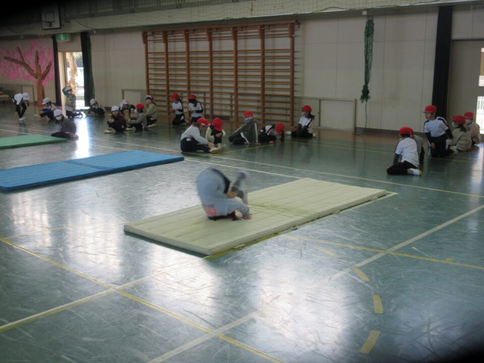 1年生は体育の時間の「マット運動」です。だんだんとパワーアップしています。