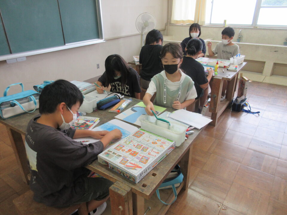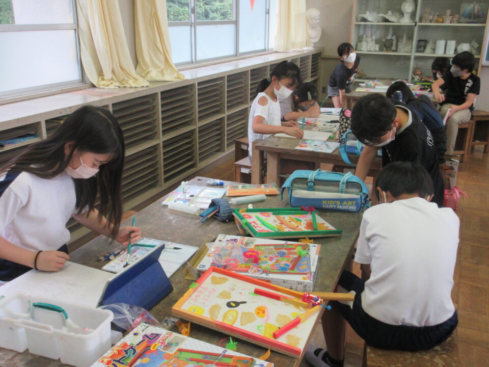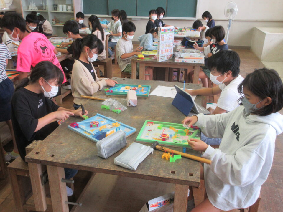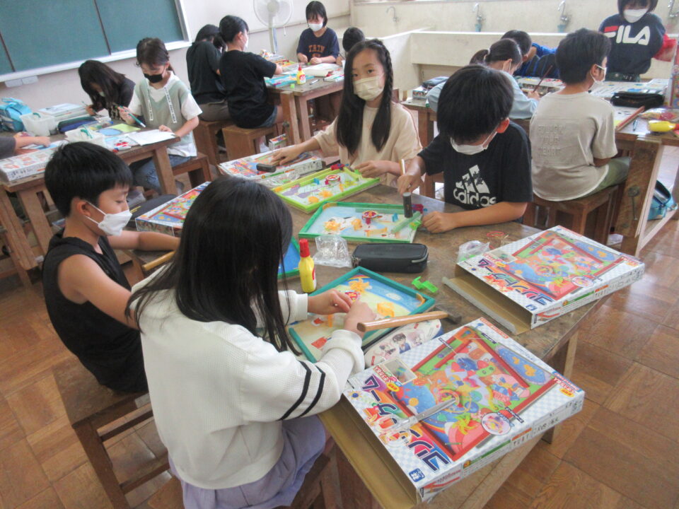 4年生の図工の時間では「コリントゲーム」の作品作りの途中です。楽しそうに取り組んでいます。