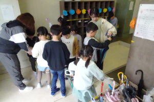 それから、今日は雨でしたので、傘の置き方、整頓の仕方を学んでいました。