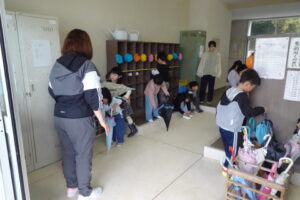 それから、今日は雨でしたので、傘の置き方、整頓の仕方を学んでいました。