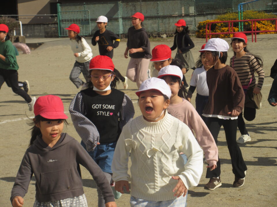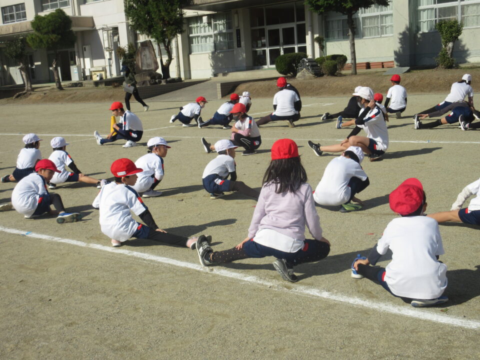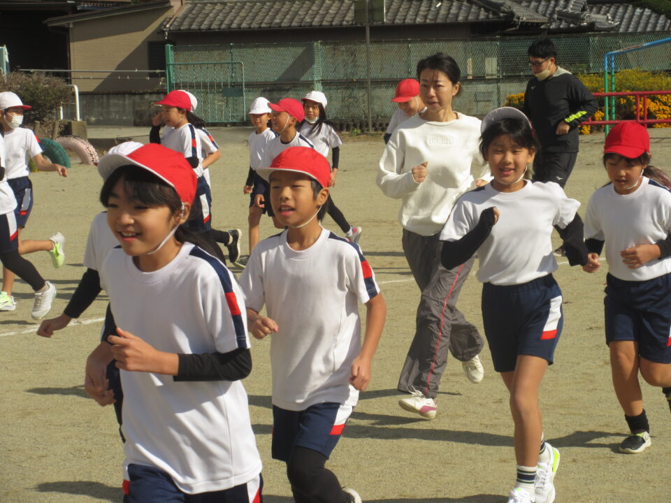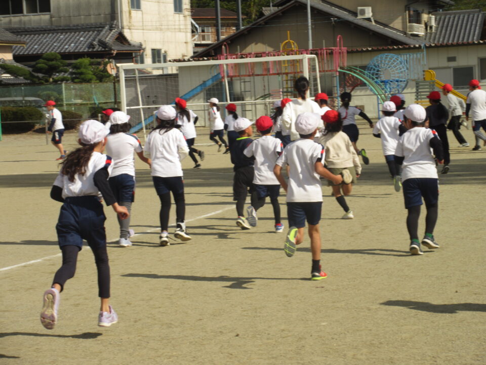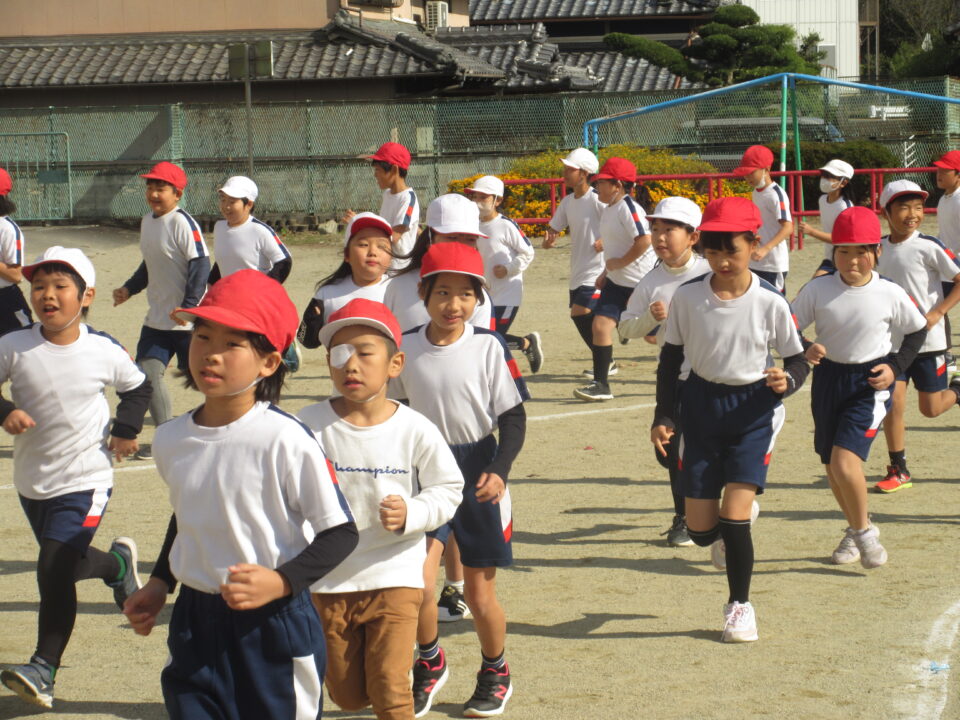 今日から業間かけ足が始まりました。天気も良く走るにはちょうど良い感じです。音楽に合わせて準備運動、かけ足が始まりました。初日にしては、みんなとってもはやく走りだしました。固まって走ると、なかなか迫力もあります。この調子でこれからもがんばりましょう。